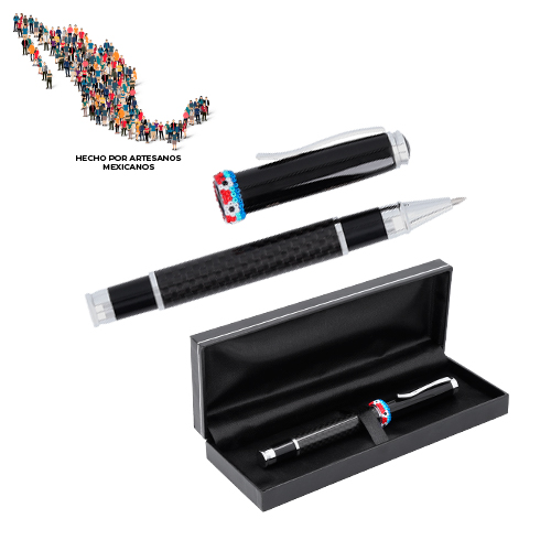 CISNEROS Bolígrafo de fibra de carbono con tapa metálica y estuche, decorado con arte huichol. Cada pieza está elaborada a mano con 120 chaquiras colocadas una a una por artesanos de Jalisco. Con cada compra apoyas el trabajo que representa el sustento económico de estas familias artesanas.