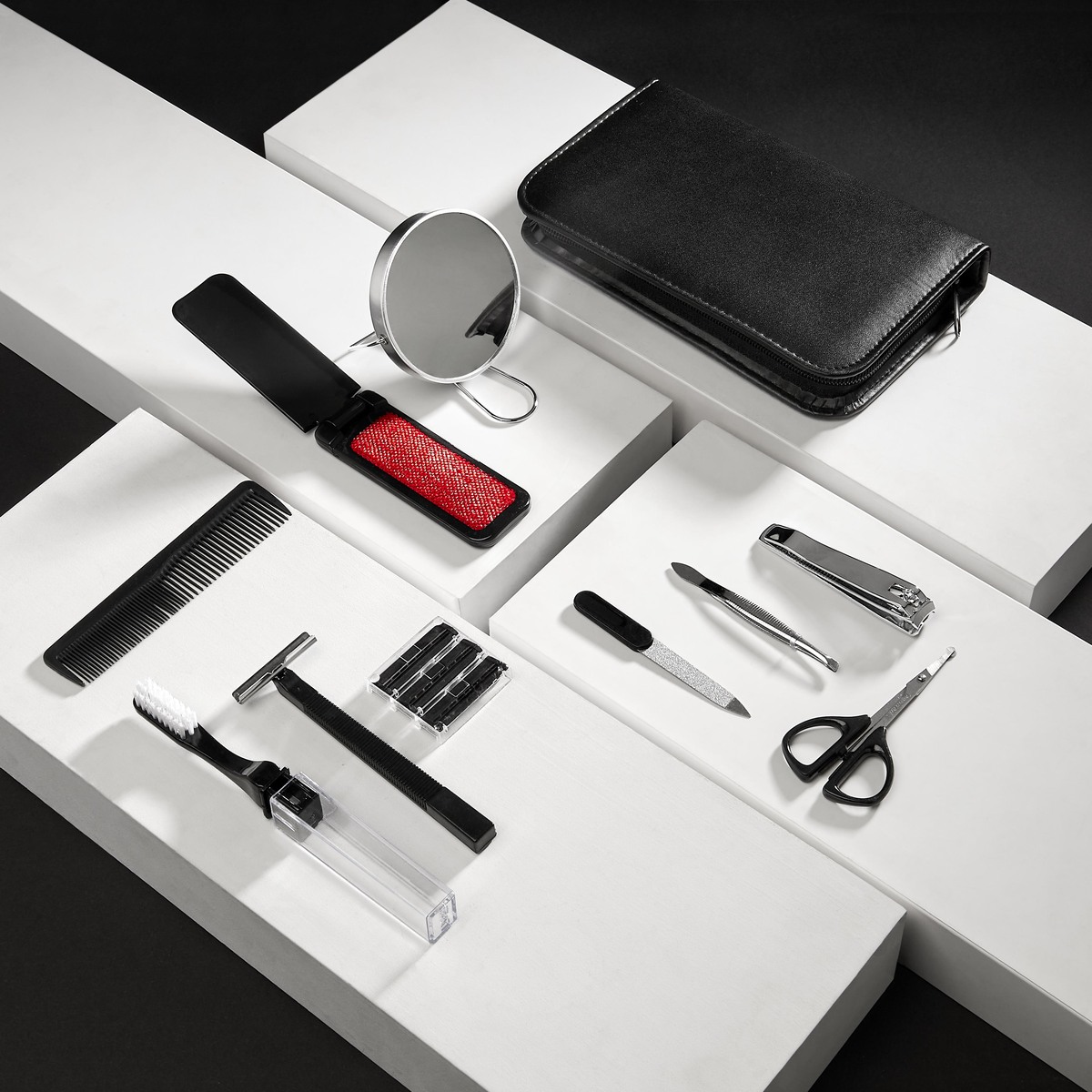 KIT DE VIAJE BARRETT - Set de cuidado personal. Ideal para tus viajes, mantente impecable en cualquier momento. Incluye los siguientes 10 accesorios: espejo, lima, cortaúñas, pinzas, tijeras, peine, cepillo dental, rastrillo con 3 navajas de repuesto y un calzador plegable con limpiador de calzado.