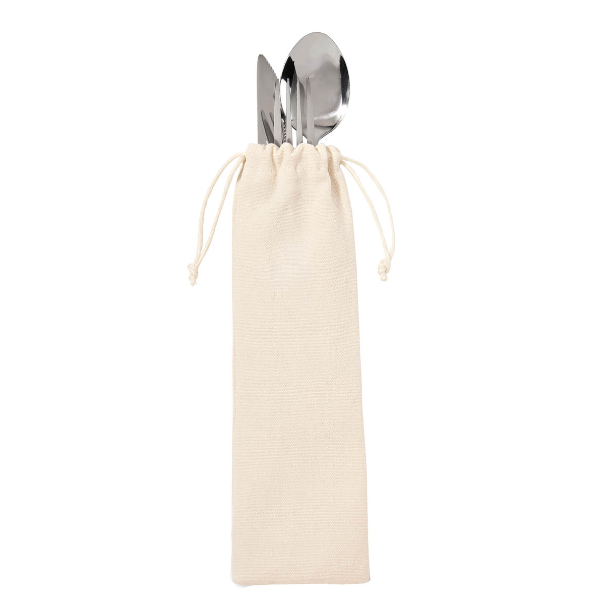 MATERIAL: Canvas / Acero Inoxidable / Madera MEDIDAS: 7 x 24 cm Bolsa / 4.1 x 19.3 cm Cuchara / 2.3 x 19.3 cm Tenedor / 1.6 x 20 cm Cuchillo IMPRESION: Serigrafía / Láser MED. EMPAQUE: 43.5 x 42 x 23.5 cm PESO EMPAQUE: 22.5 Kg PIEZAS EMPAQUE: 150