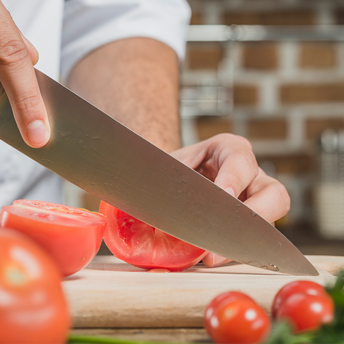 Set de Cuchillos. - Set de BBQ fabricado en acero inoxidable y mangos de roble, incluye 7 piezas (cuchillo de chef, cuchillo pequeño, cuchillo deshuesador, cuchillo para carne, tenedor, afilador y tabla para cortar de madera).