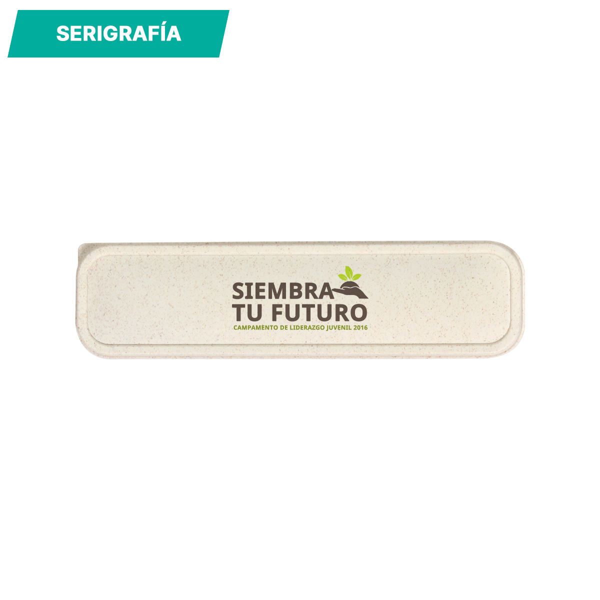 MATERIAL: FIBRA DE TRIGO MEDIDAS: 21x5.5 cm. IMPRESION: Serigrafía / Tampografía MED. EMPAQUE: 21x5.5 cm.x0 PESO EMPAQUE: 14 kg. PIEZAS EMPAQUE: 180