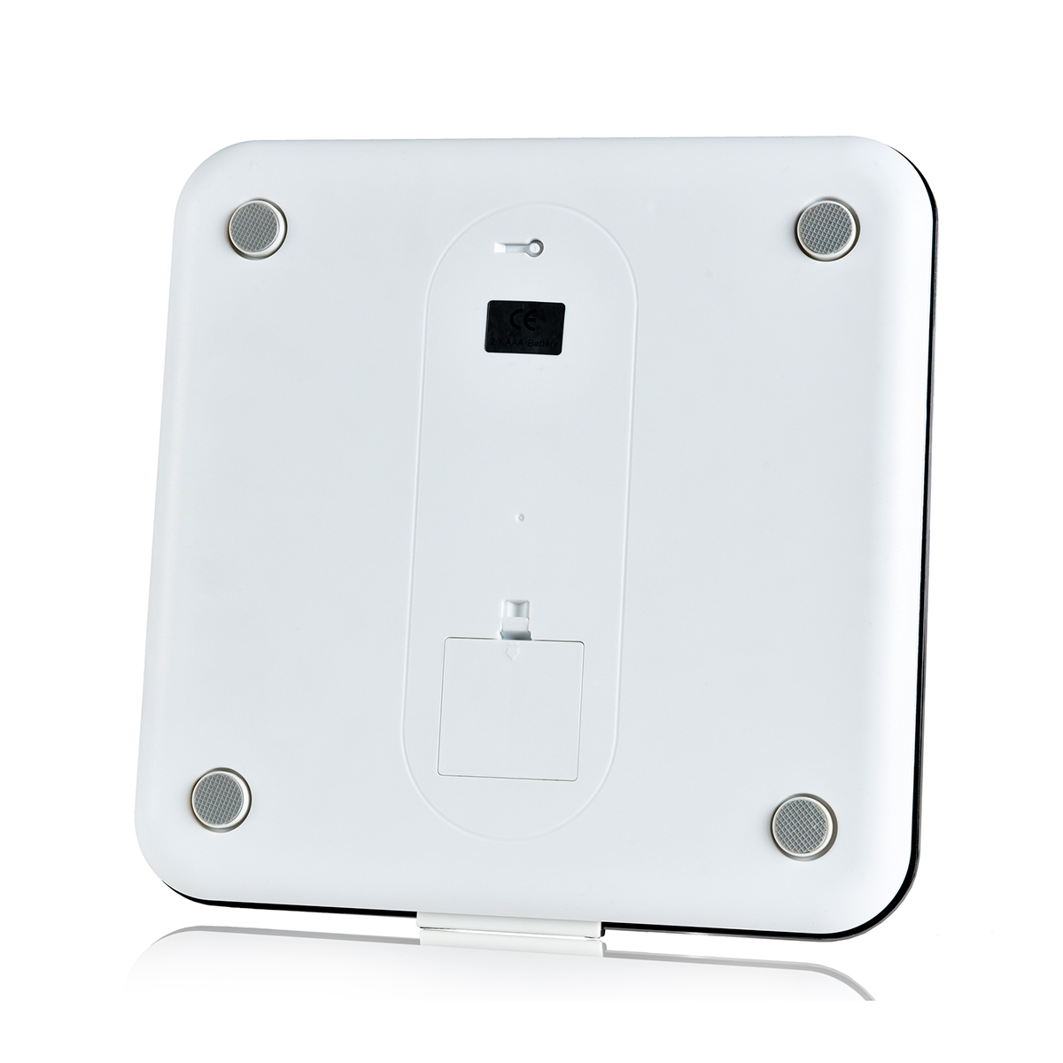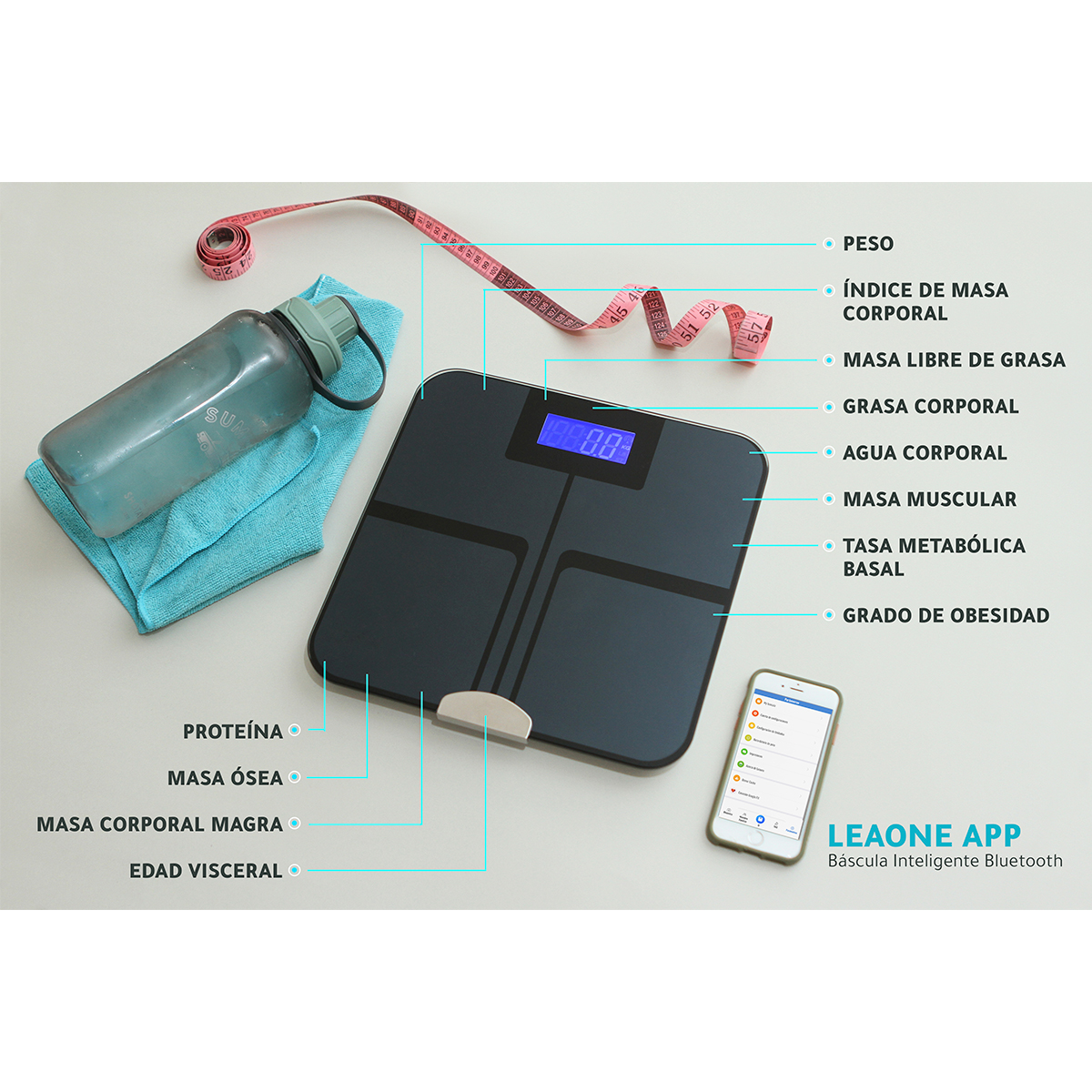Báscula Nyeri. - Báscula de cristal templado con base de plástico, APP para vincular a dispositivo móvil, ocupa 4 baterías AAA, (no incluidas) se puede monitorear: peso, índice de masa corporal, grasa corporal, agua corporal, masa muscular, grado de obesidad, proteína, masa ósea, edad visceral, entre otras. Capacidad de 3 a 180 kg.