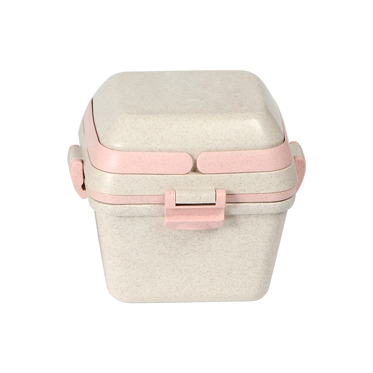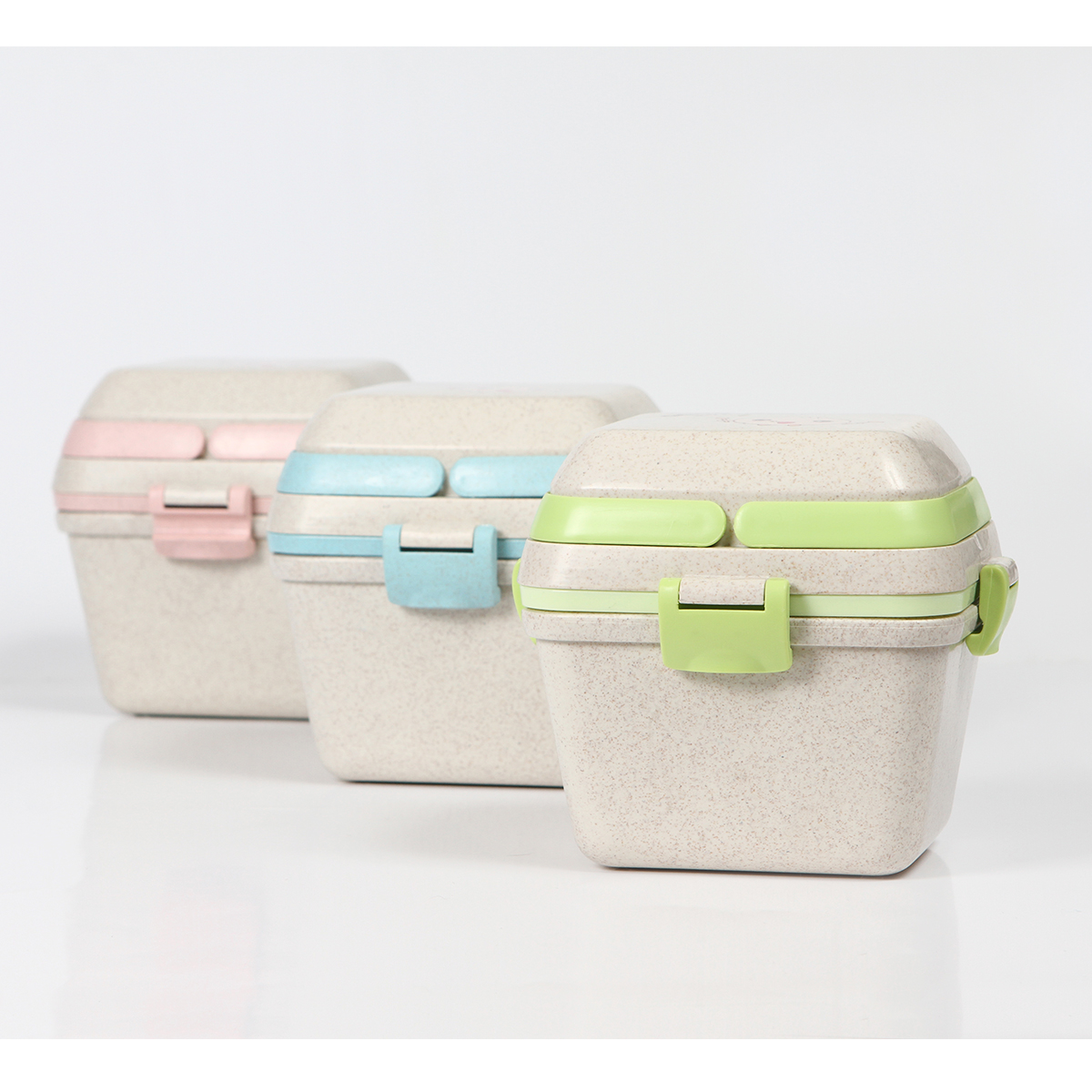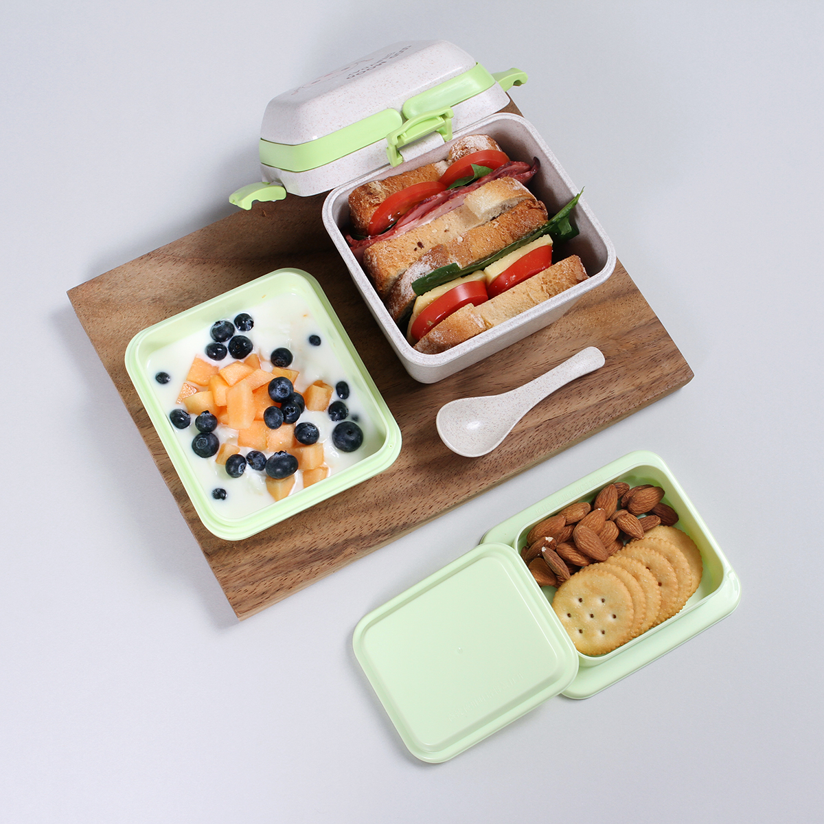 Contenedor Mombasa. - Contenedor para alimentos fabricado en fibra de trigo con PP (Polipropileno). Con 3 compartimentos (650+350+150 ml), asas superiores, clips de seguridad y cuchara.