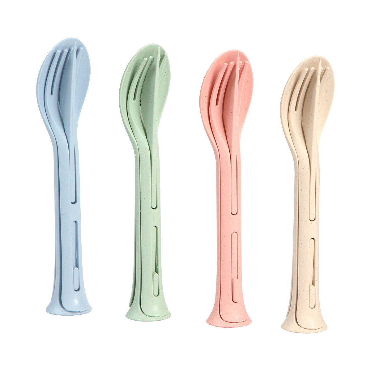 Set de Cubiertos Bekasi. - Set de cubiertos desmontables fabricados en fibra de trigo y polipropileno, contiene cuchara, tenedor y cuchillo . Incluye en caja de cartón individual. Son ideales para viajar y ser responsables con el medio ambiente.