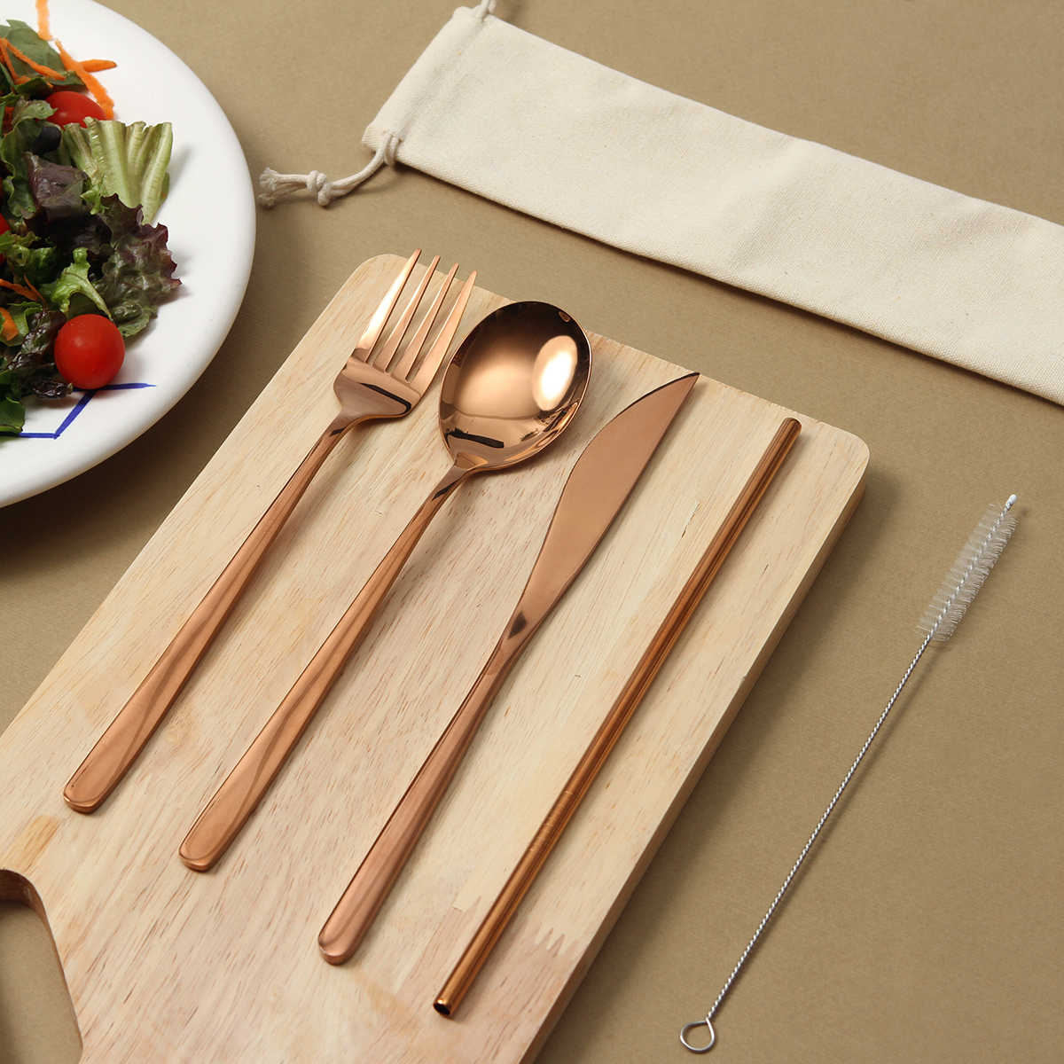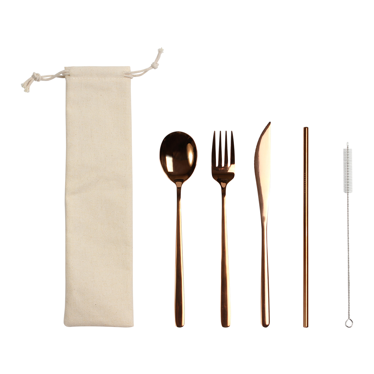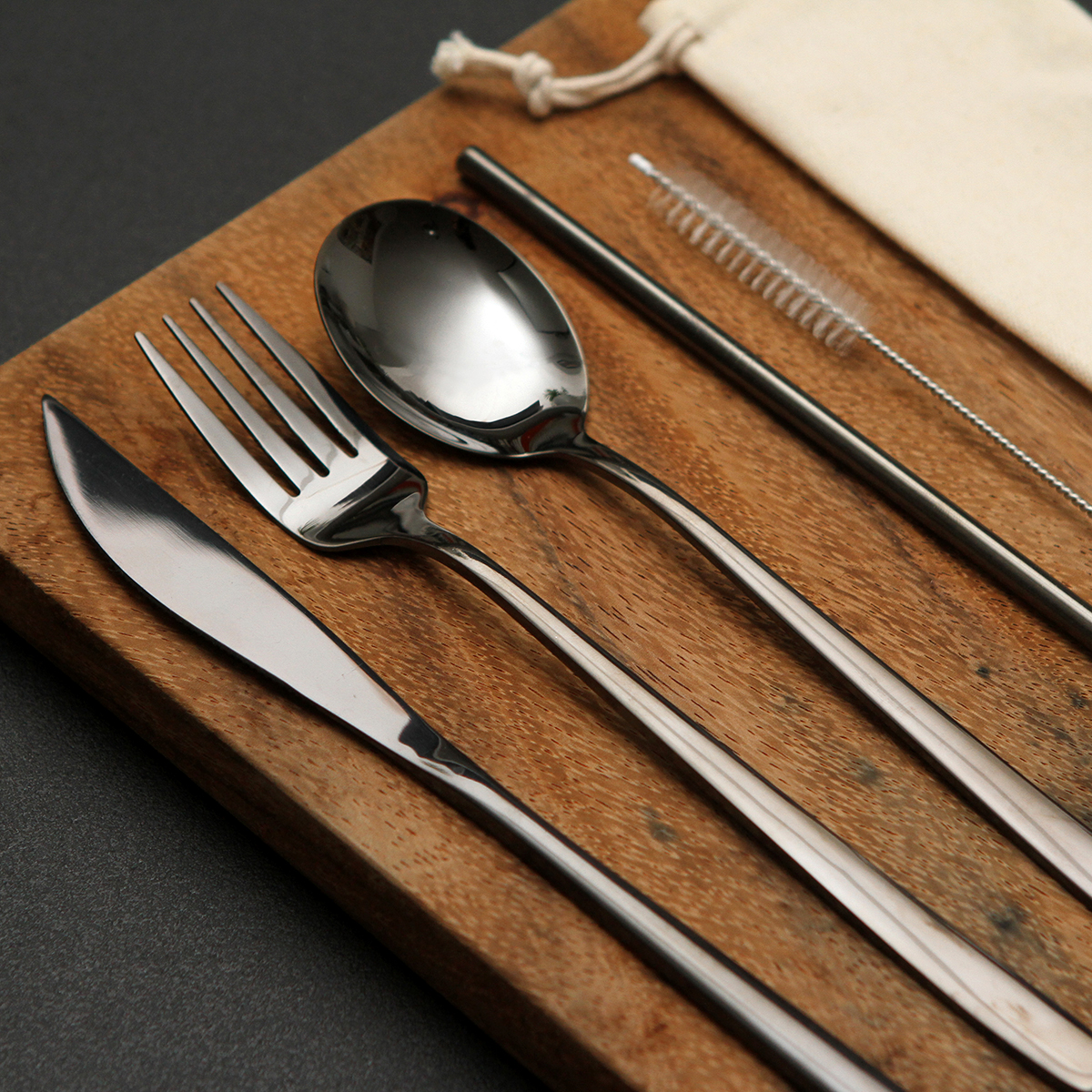 Juego de Cubiertos Cimahi. - Juego de cubiertos fabricados en acero inoxidable; incluye cuchillo, tenedor, cuchara, popote y cepillo limpiador. Incluye bolsa de algodón de fácil cierre y apertura. Los cubiertos se pueden grabar y la bolsa cuenta con amplia área para impresión. Son ideales para viajar y responsables con el medio ambiente.