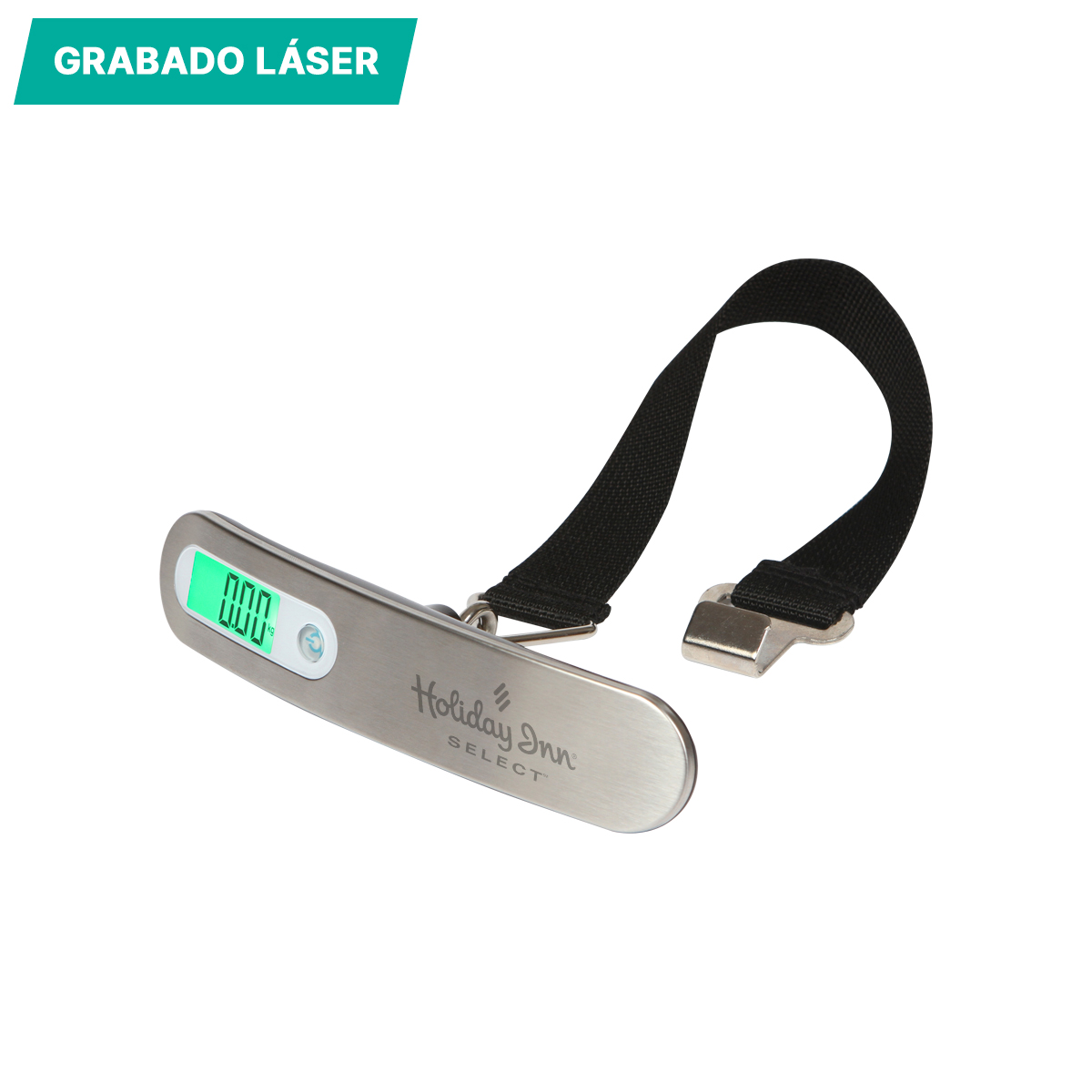 Báscula Encamp. - Báscula electrónica para equipaje fabricada en plástico ABS y protección de metal, con cinta de tela y gancho de metal. Sensible a un peso mínimo de 100 gr y soporta un peso máximo de 50 kg. Incluye baterías y caja de cartón.