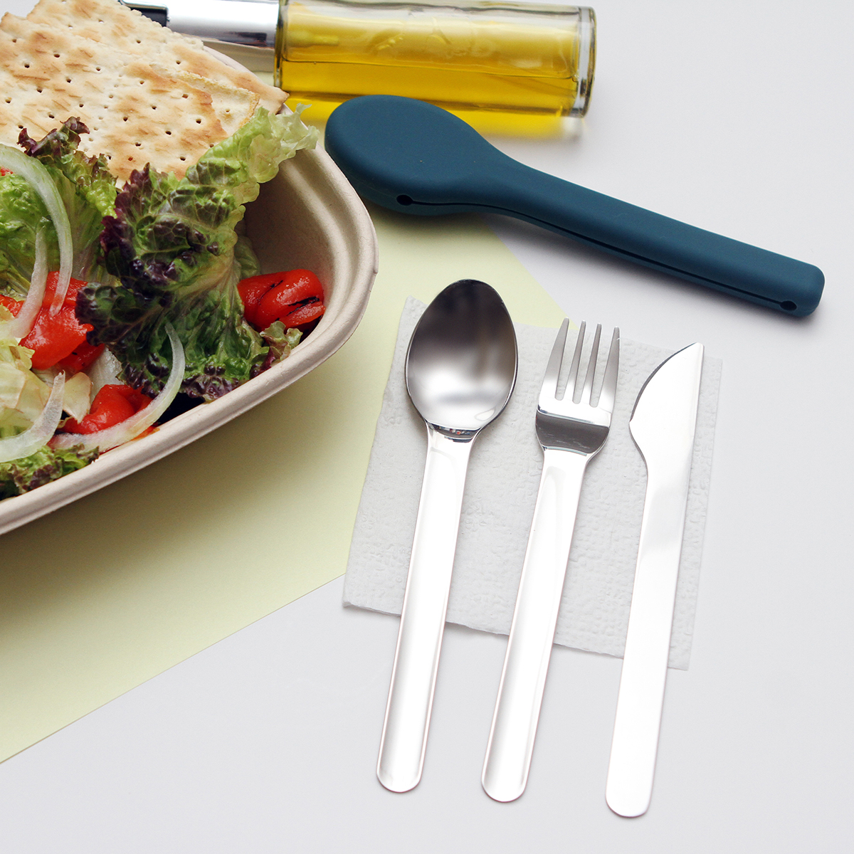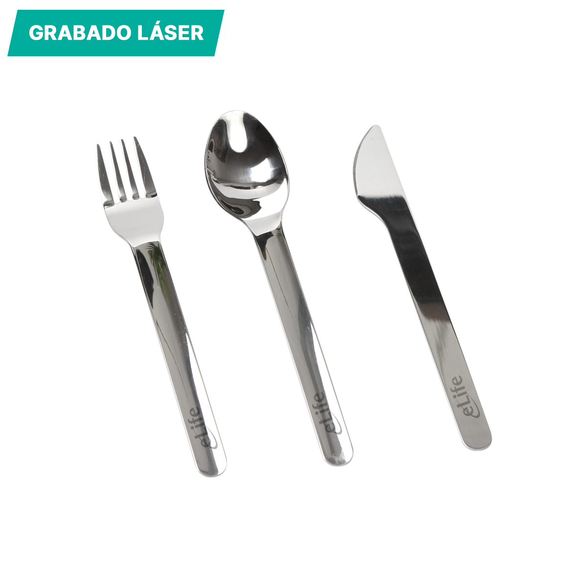 Juego de cubiertos Jarkov. - Juego de cubiertos fabricados en acero inoxidable con cubierta de silicón. Incluye cuchillo tenedor y cuchara. Incluye caja de cartón individual. Es ideal para traerlo siempre contigo y evitar usar cubiertos desechables.