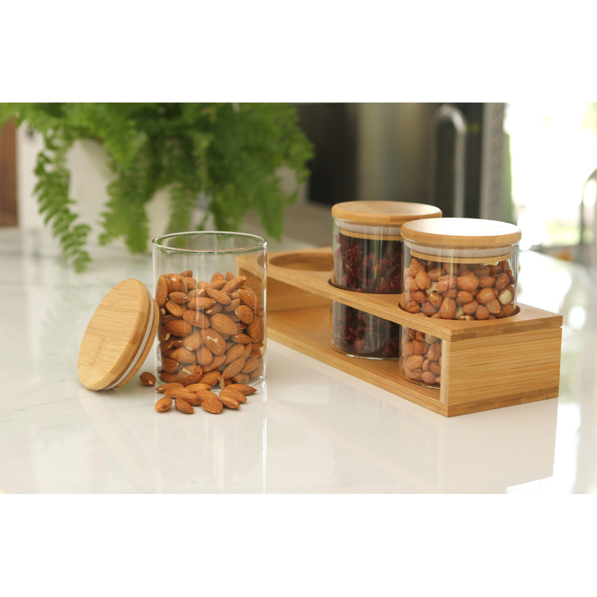 Juego de contenedores Horki. - Set de 3 contenedores de 500 ml fabricados en vidrio de borosilicato con tapa y base de bambú. Incluye caja de cartón individual. Mantén tus alimentos siempre frescos con el sistema de cerrado hermético.