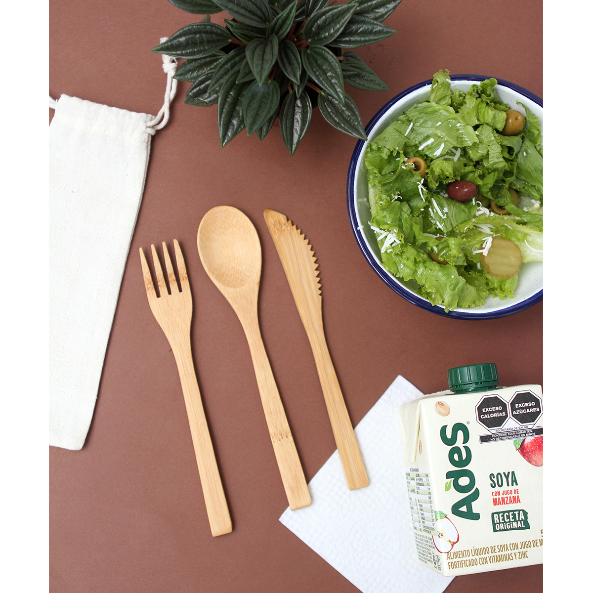 Set de cubiertos Castella. - El set de cubiertos reutilizables fabricados en bambú es una elección eco-amigable que combina funcionalidad, estilo y sostenibilidad. Con cuchara, tenedor, cuchillo y bolsa de algodón,  permite disfrutar de tus comidas mientras contribuyes a la reducción de residuos plásticos desechables.