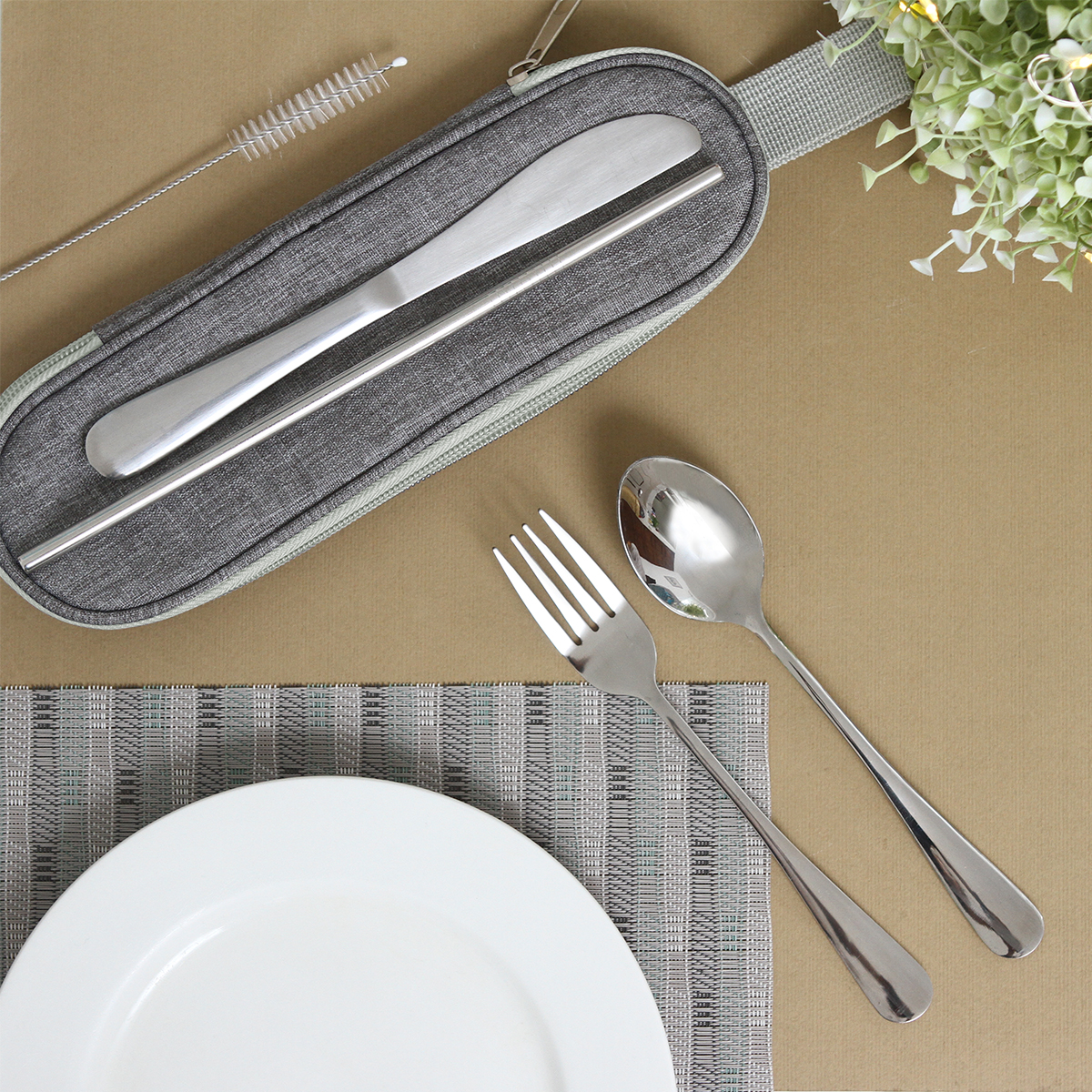 Set de Cubiertos Milano. - Set de cubiertos de acero inoxidable con 5 piezas con estuche de cierre con asa a un costado de poliéster reciclado (RPET). Incluye: cuchara, tenedor, cuchillo, popote, cepillo.El RPET es un material resistente y duradero que puede soportar el uso diario y el desgaste, lo que lo hace ideal para productos textiles. Además es sostenible porque utilizan materiales reciclados en su fabricación, lo que reduce la cantidad de residuos y disminuye el impacto ambiental.
