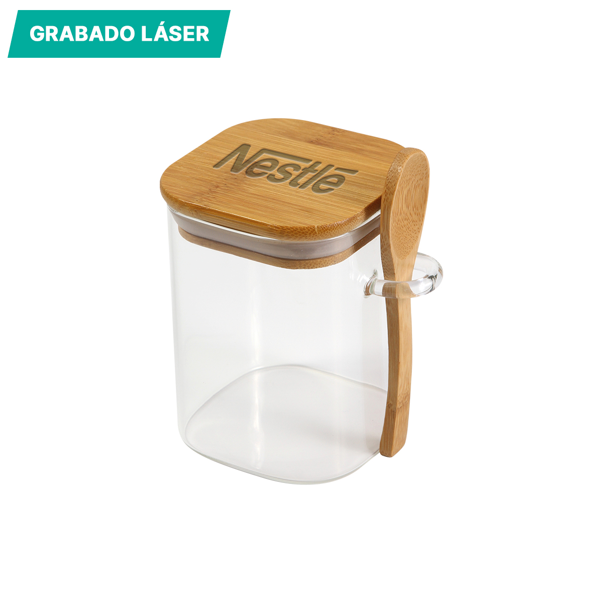 Contenedor Jakar. - Contenedor fabricado en vidrio de borosilicato, con tapa y cuchara de bambú. El contenedor cuenta con un accesorio especial para colocar la cuchara. Ayuda a preservar la frescura y la integridad de los alimentos almacenados en su interior. Además, la madera de bambú es conocida por su durabilidad y resistencia, lo que garantiza una larga vida útil del recipiente. Tamaño práctico. Incluye Caja de Cartón Individual. Capacidad de 500 ml.