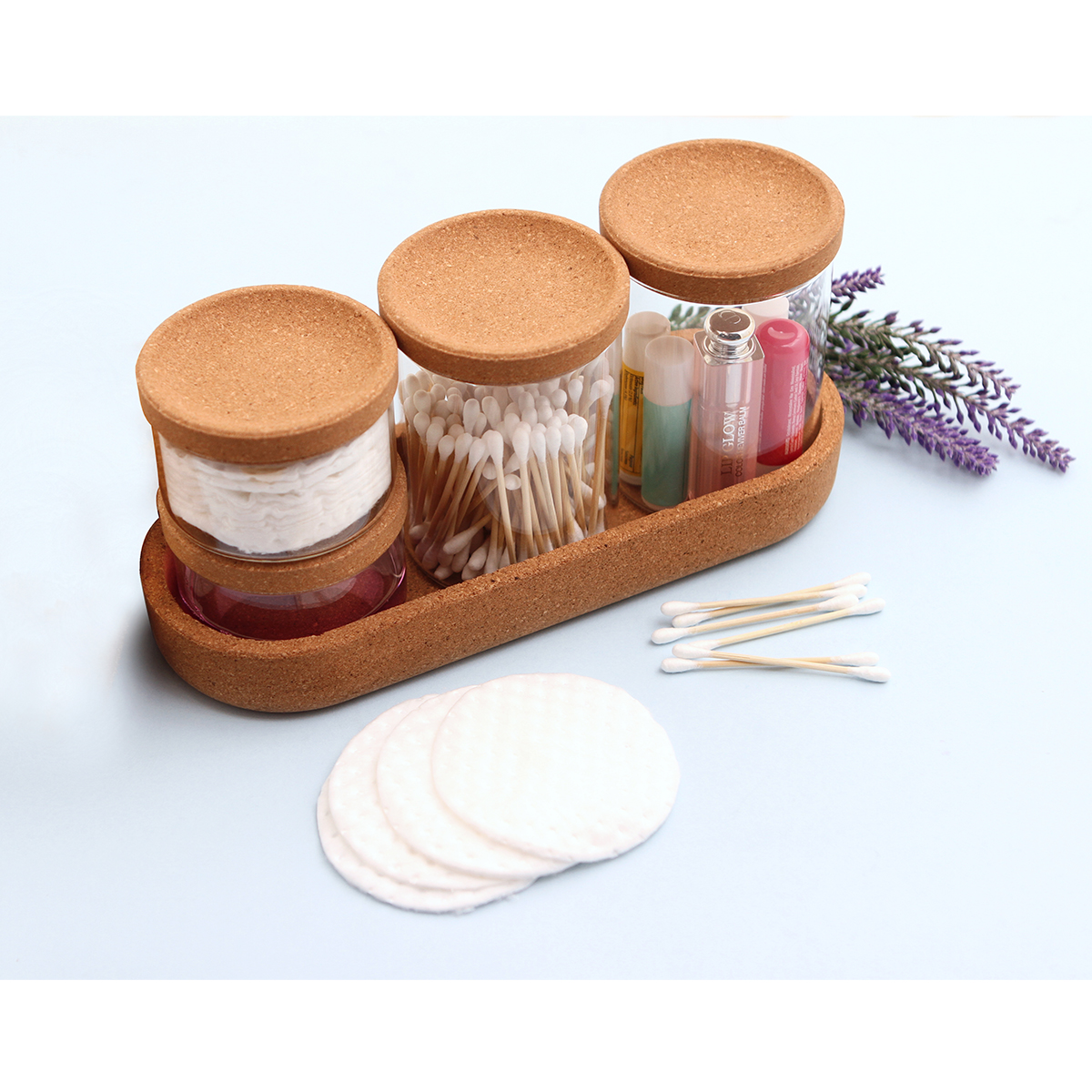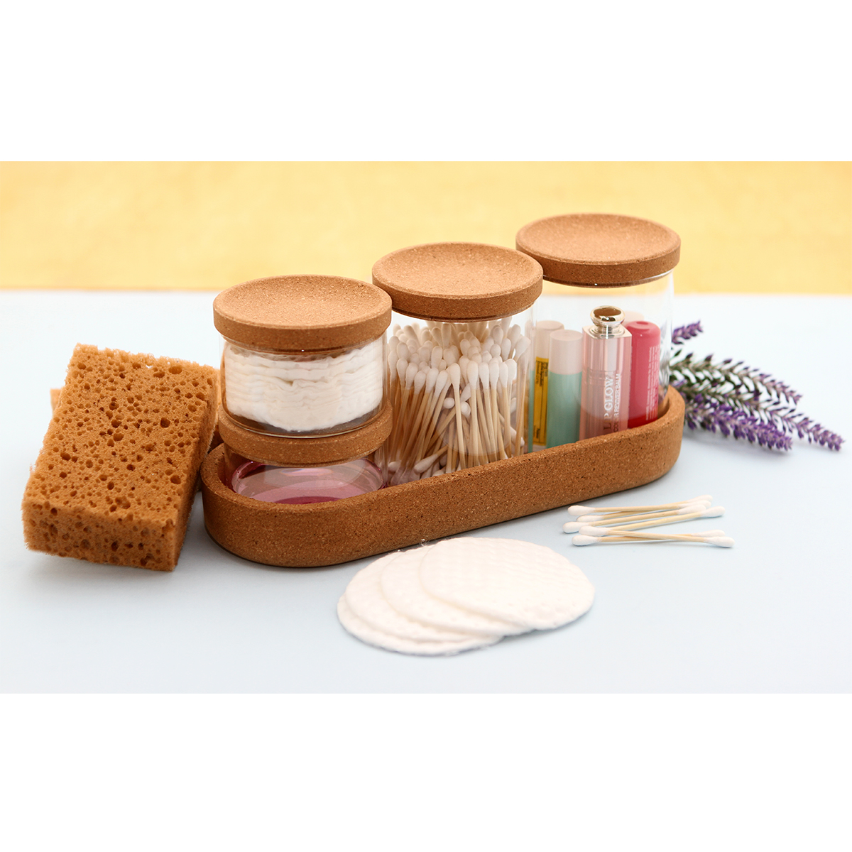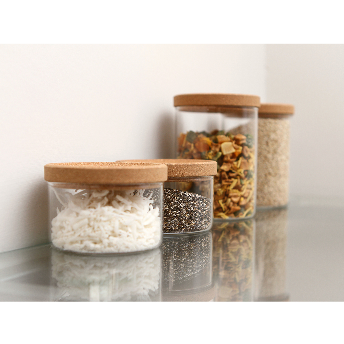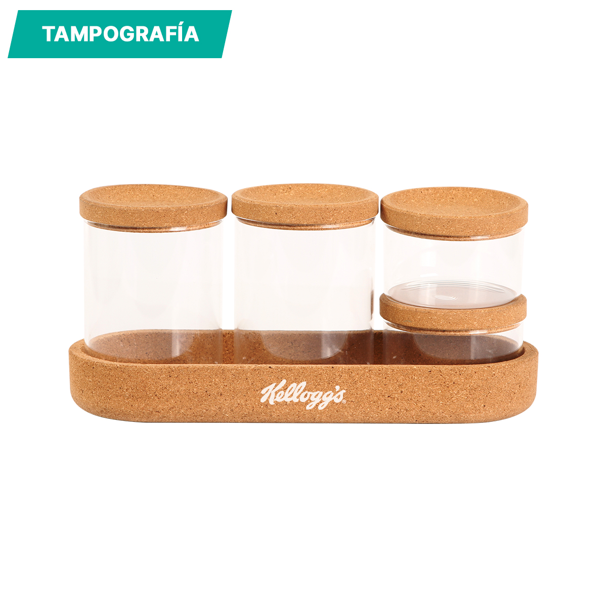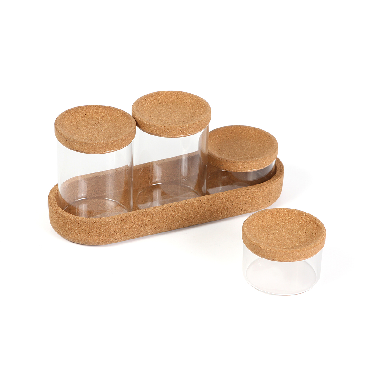 Set Buraimi. - Set de contenedores fabricados en borosilicato (vidrio) con tapa de corcho, ideales para alimentos o artículos diversos. Incluye dos envases de 8x10 cm, dos envases de 8x4 cm y una base fabricada en corcho.