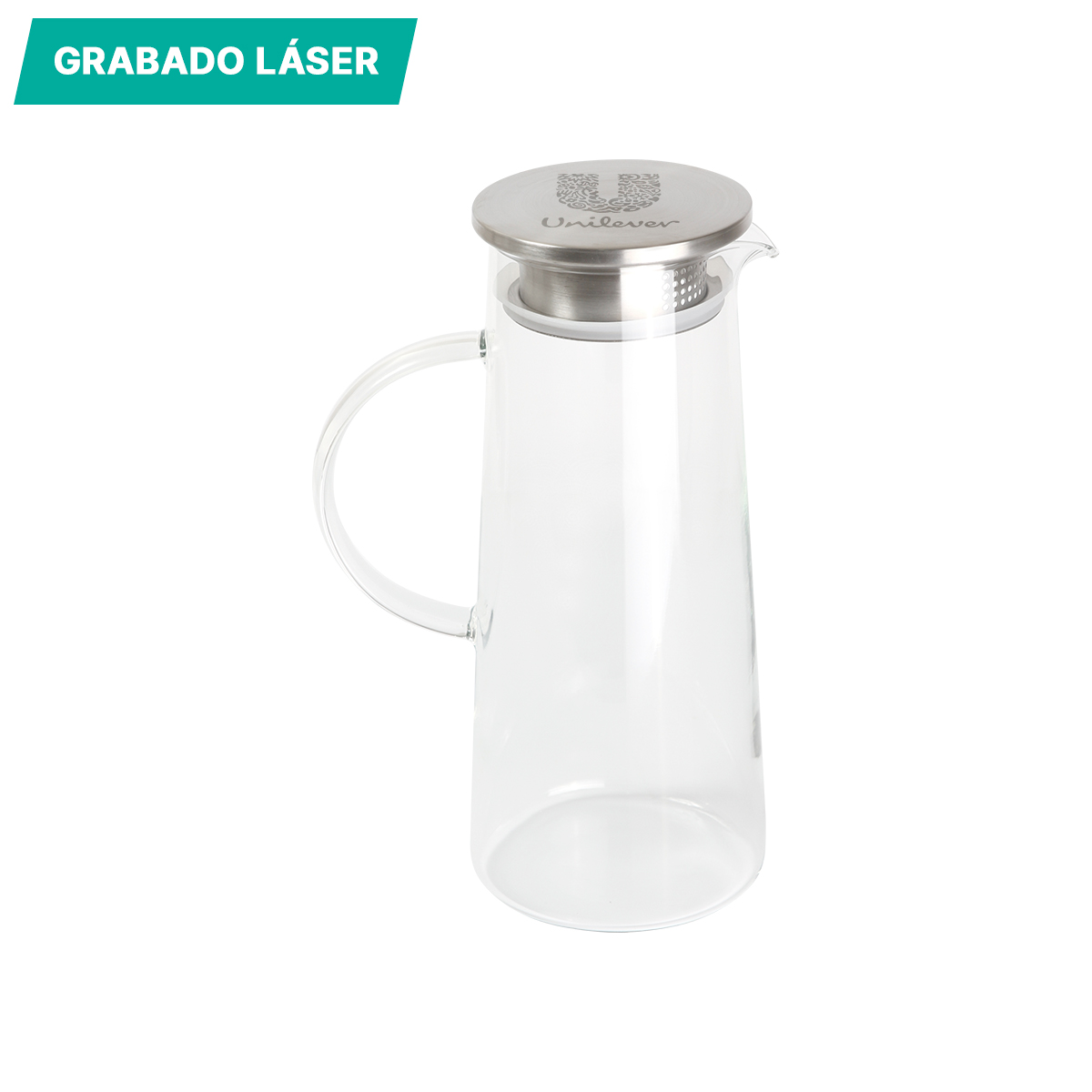 Jarra Kiruna. - Jarra para agua de diseño transparente fabricada en vidrio de borosilicato. Cuenta con capacidad de 1,800 ml, y peso de 430g. Inlcuye tapa en color metálico, de acero inoxidable, y asa.