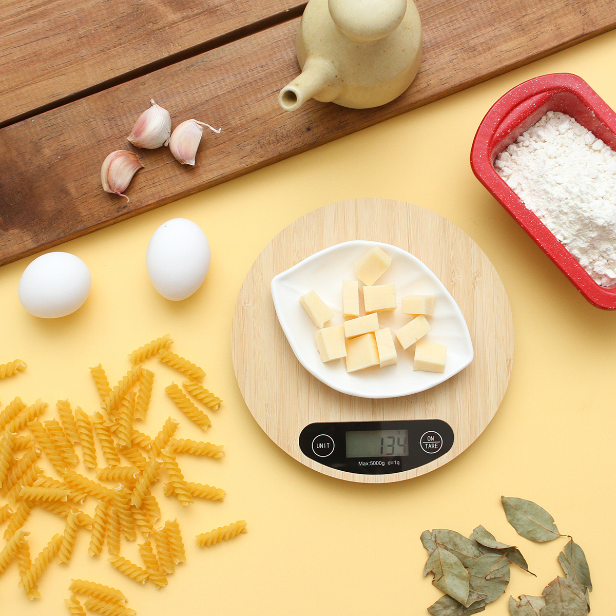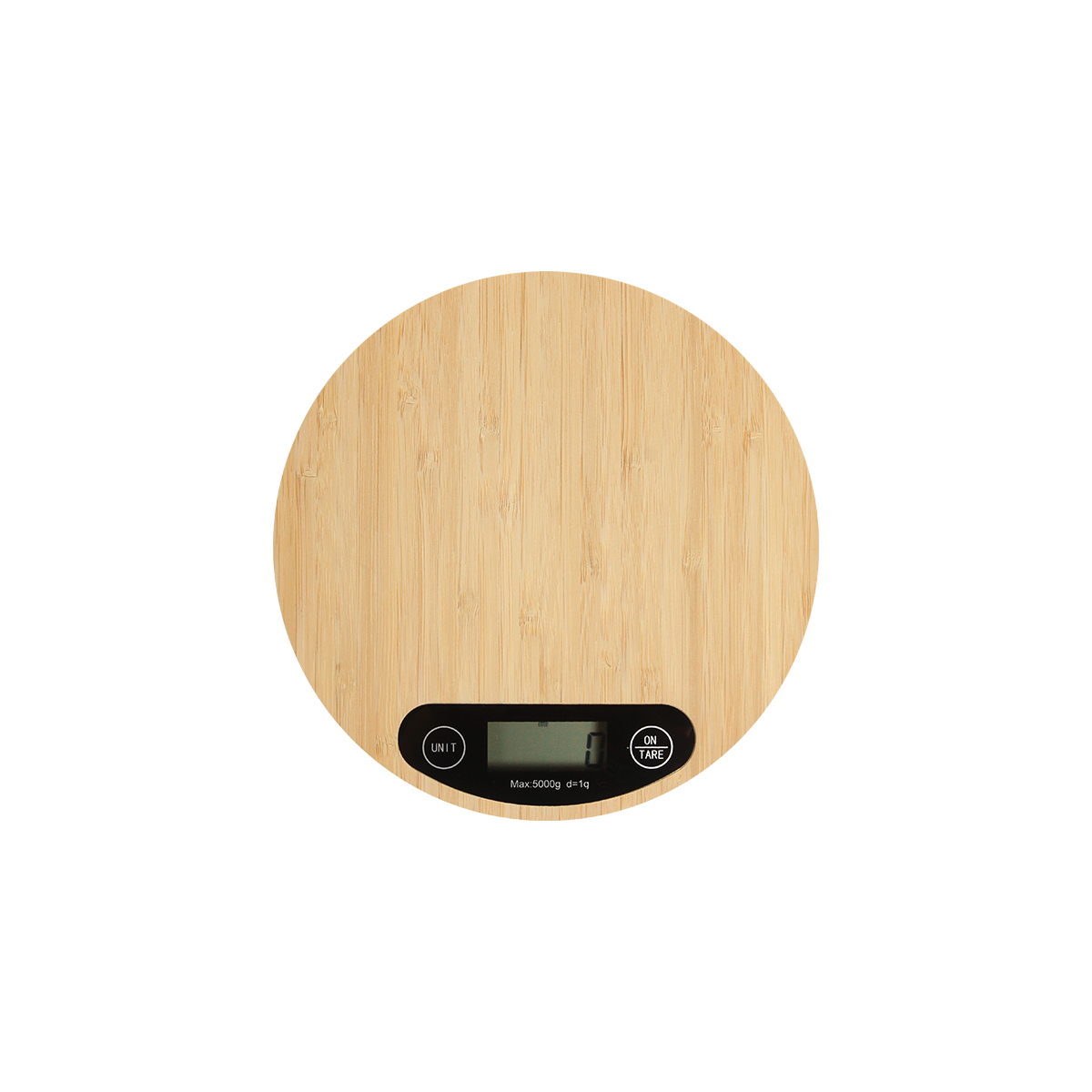 Báscula Viborg. - Báscula electrónica para cocina fabricada en bambú y ABS, capacidad de 5 kg. Puede contabilizar en cuatro medidas distintas: gramos, libras, onzas liquidas y mililitros.