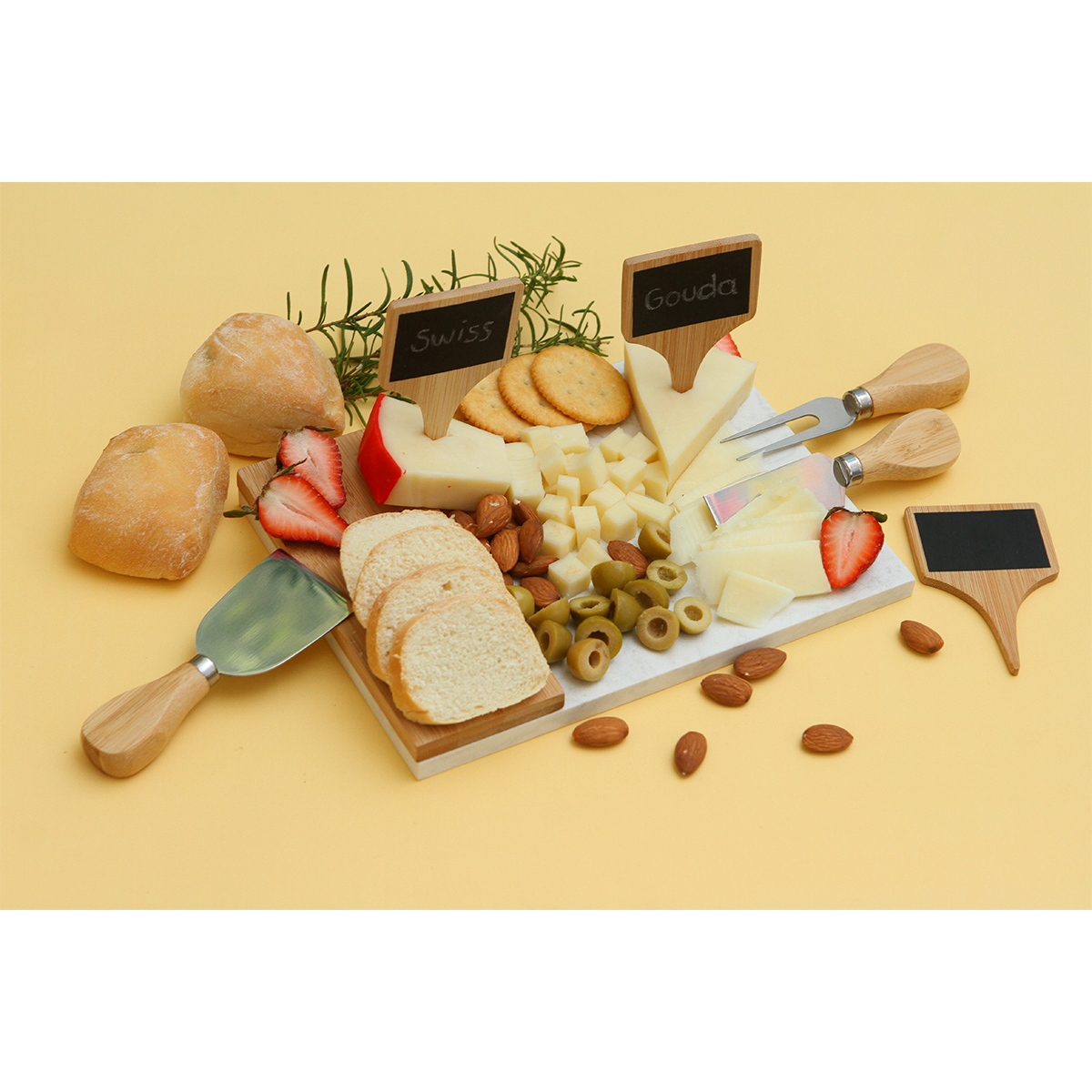 Set Sovareto. - Set de quesos fabricado en mármol y madera de bambú. Incluye 3 marcadores de madera y 3 utensilios de acero inoxidable, especiales para quesos. Su diseño en mármol le otorga un perfil elegante, que lo hace la opción indicada para reuniones. Un set práctico y sofisticado que facilita la presentación en reuniones y añade un toque gourmet a cualquier ocasión.