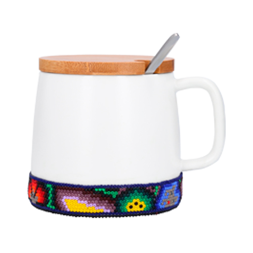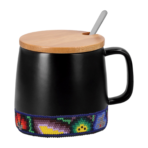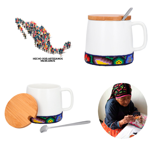 FRIDA Taza de cerámica mate con tapa de bambú, decorada con arte huichol. Cada pieza está elaborada a mano con 1,200 chaquiras colocadas una a una por artesanos de Jalisco. Con cada compra apoyas el trabajo que representa el sustento económico de estas familias artesanas.