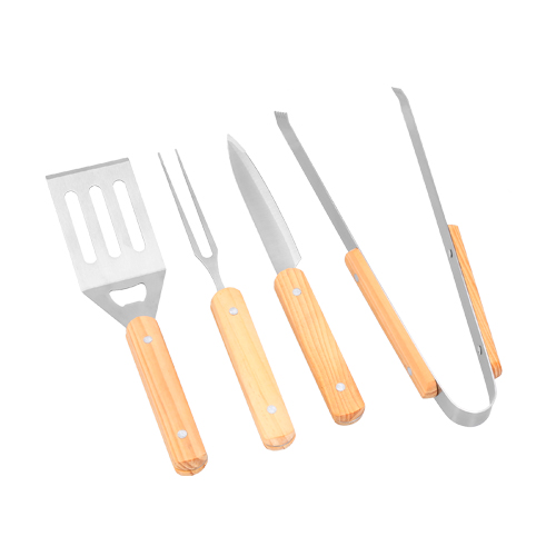 ENTRECOT Set de BBQ en estuche de poliéster y sujetadores de madera. Incluye 4 utensilios: pinzas, tenedor, cuchillo y volteador.