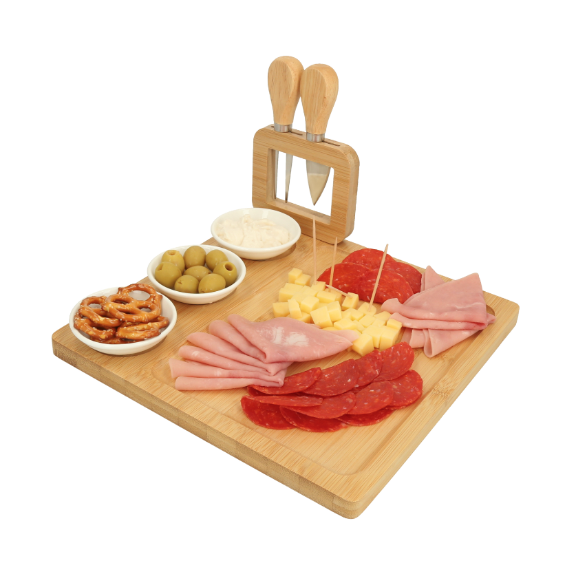 EDAM Tabla de quesos que incluye 3 mini platos de cerámica, un tenedor para quesos y un cuchillo.