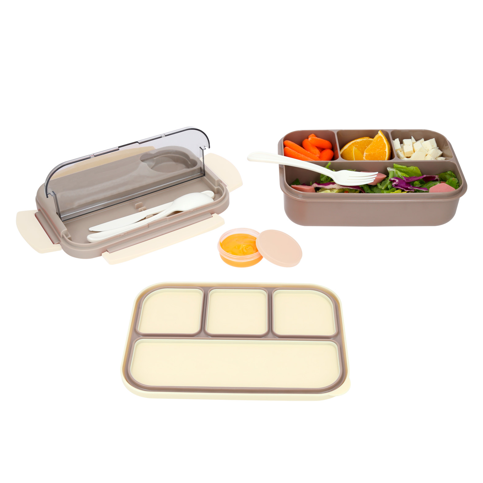 JIM Contenedor de alimentos de plástico con 4 compartimentos, con doble tapa, 4 broches de seguridad y mini recipiente. Incluye cuchara, tenedor y cuchillo.