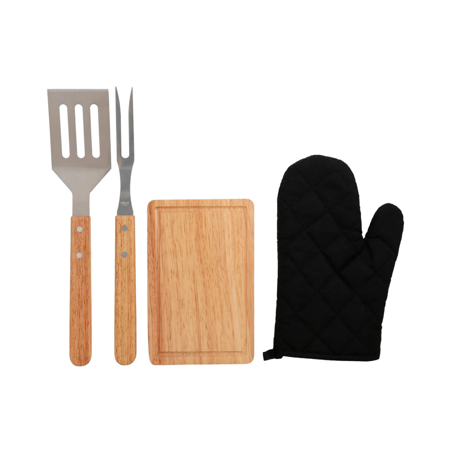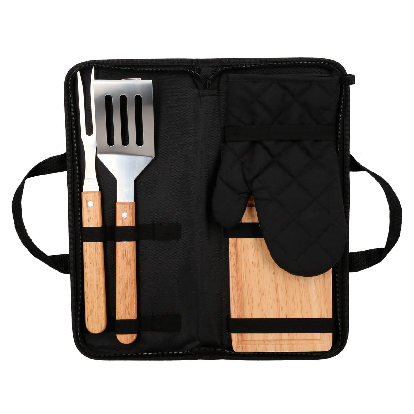 SKIRT Estuche portatil con utensilios para BBQ. Incluye tenedor, volteador, cuchillo, tabla y guante.