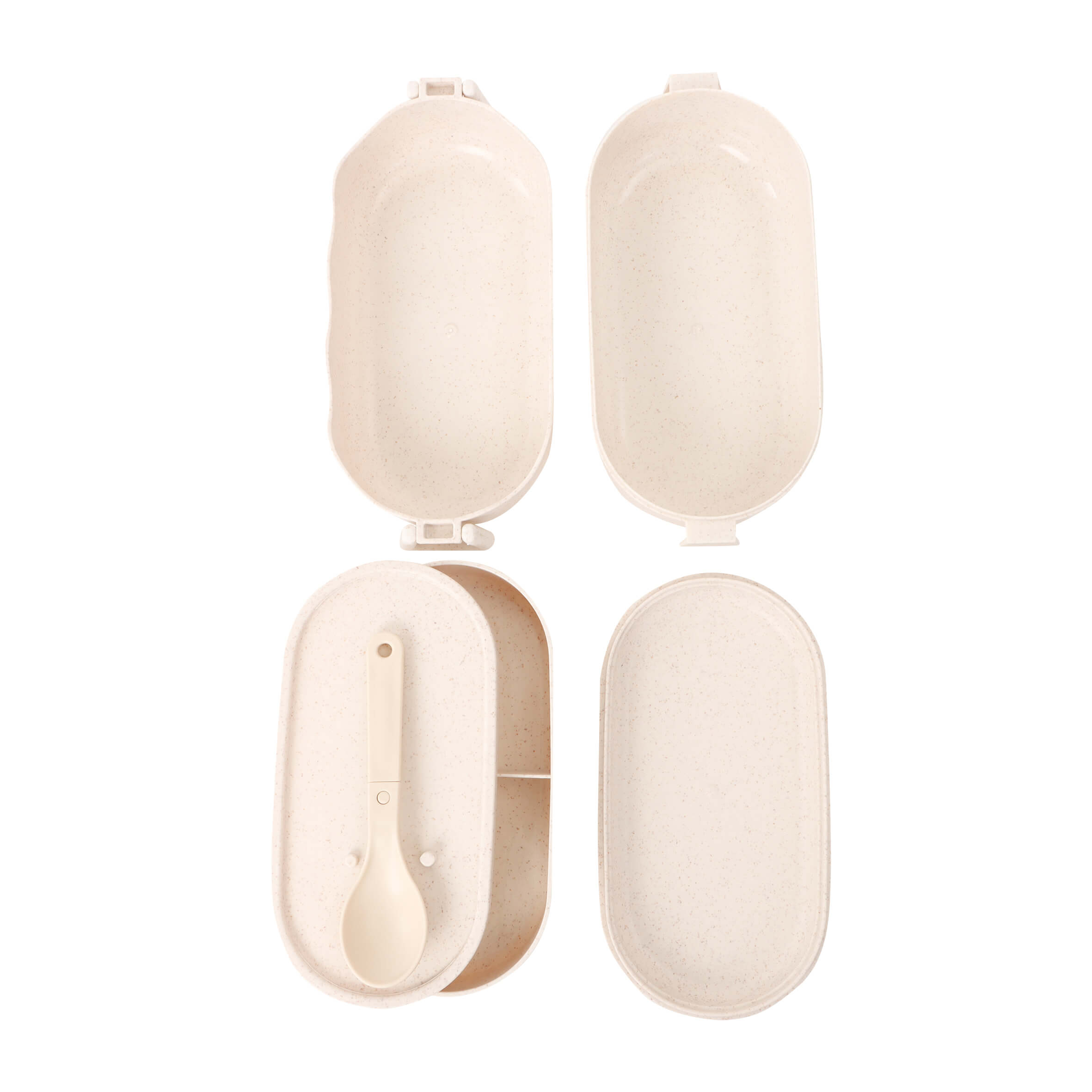 RISOTTO Contenedor de alimentos con dos compartimentos principales, separador de comida, cuchara y broches laterales.