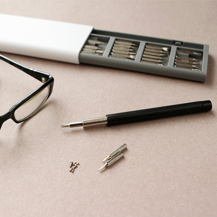 Set de herramientas Yumbe. - Set de plástico color blanco con 24 puntas de desarmador intercambiables y mango adaptador.