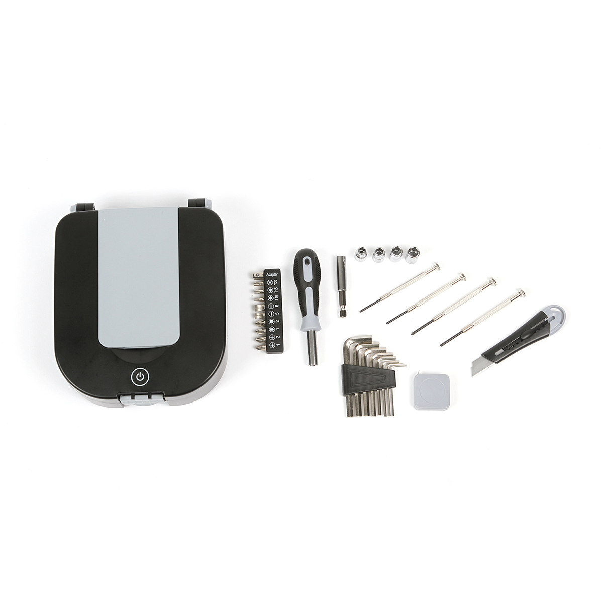 Set Cergy. - Set de herramientas con lámpara fabricado en plástico ABS, polipropileno con herramientas fabricadas en acero #45. Con medida de la caja de 19.3*15.5*6cm, este set contiene 30 piezas en total, distribuidas de la siguiente manera: 4 llaves de tubo. 1 cuchillo, 1 extensión, 1 mango destornillador, 4 piezas de destornillador a presión, 10 puntas de destornillador, 1 cinta métrica de 1 metro de longitud, 8 piezas de llave hexagonal. Una lámpara de luz LED, incluye luz blanca y luz cálida. Necesita pilas AA, no incluidas.