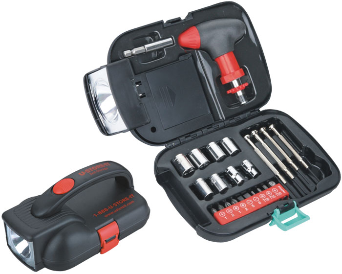 NAVIGATOR - Juego de herramientas con lámpara. Incluye: maneral y extensión, 8 dados, 10 puntas de desarmador, 4 desarmadores de relojero. Utiliza 4 baterías AA (no incluidas). Presentación: caja en color negro.