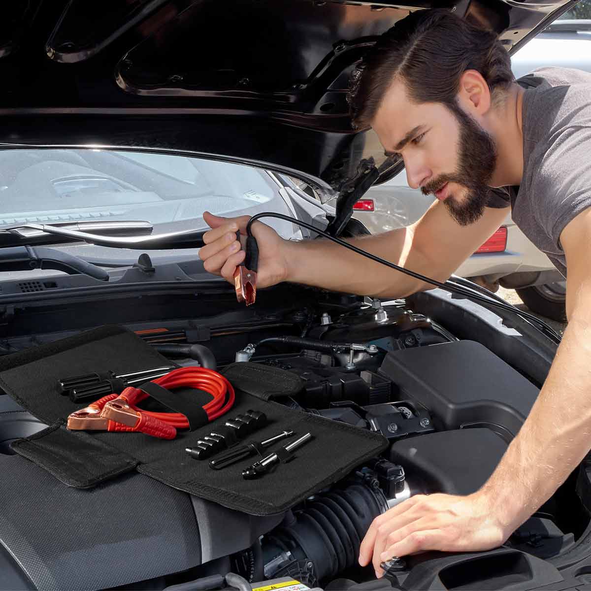 SET DE EMERGENCIA HUESCA - Contiene cables pasa corriente (100 amp), 9 dados, medidor de presión de aire, desarmador punta de cruz, desarmador punta plana, desarmador para dados. Incluye estuche de tela.