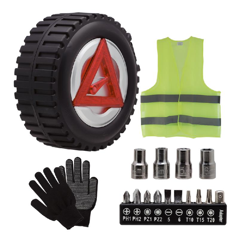 Set de herramientas en forma de llanta que contiene: Alicate, Mango de desarmador, Vástago o caña de desarmador, Medidas: 25 x 11 cm Material: Plástico y accesorios metálicos.