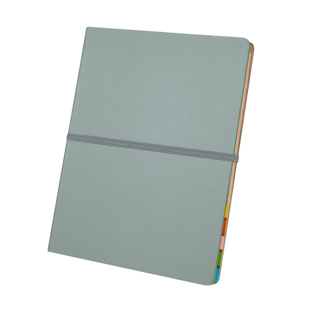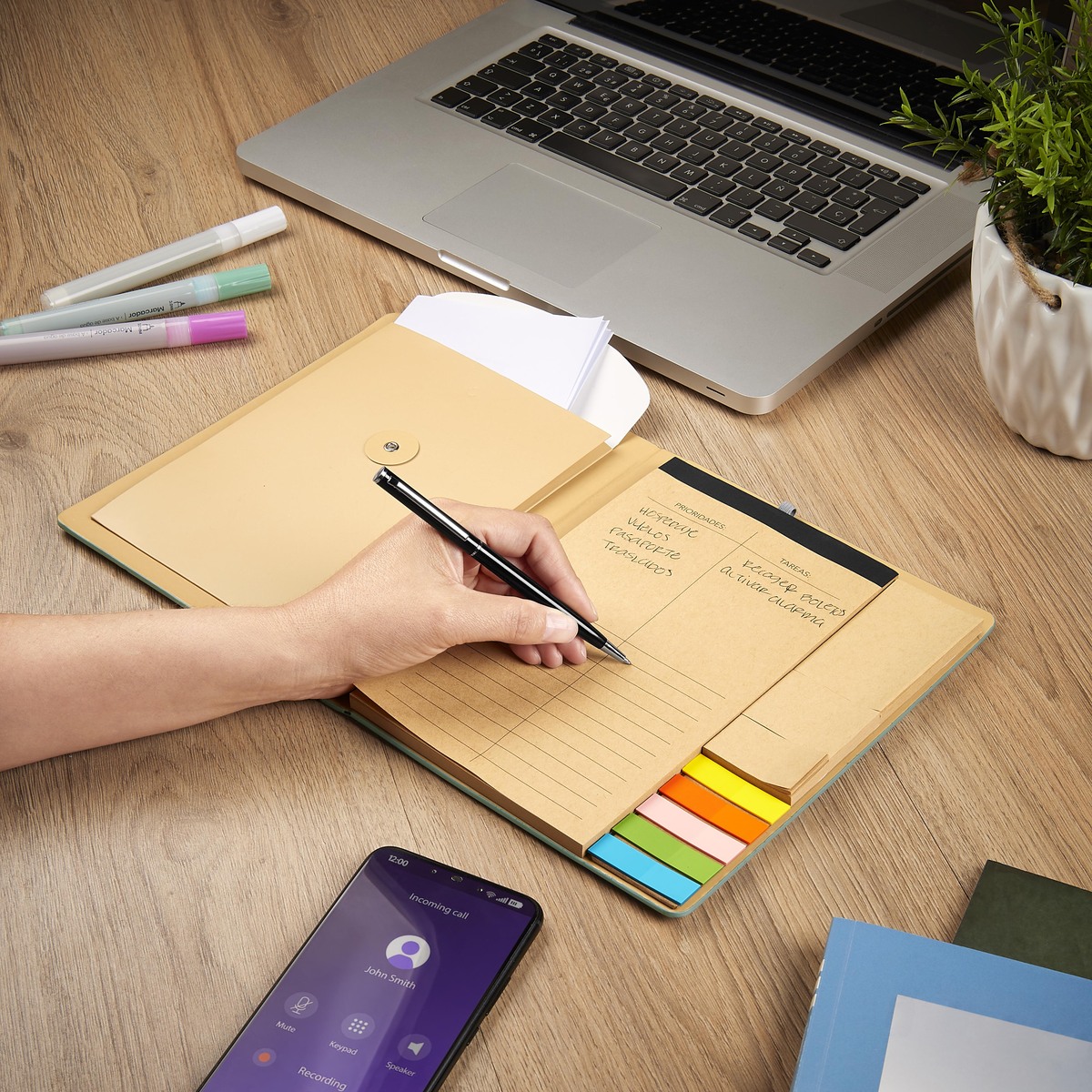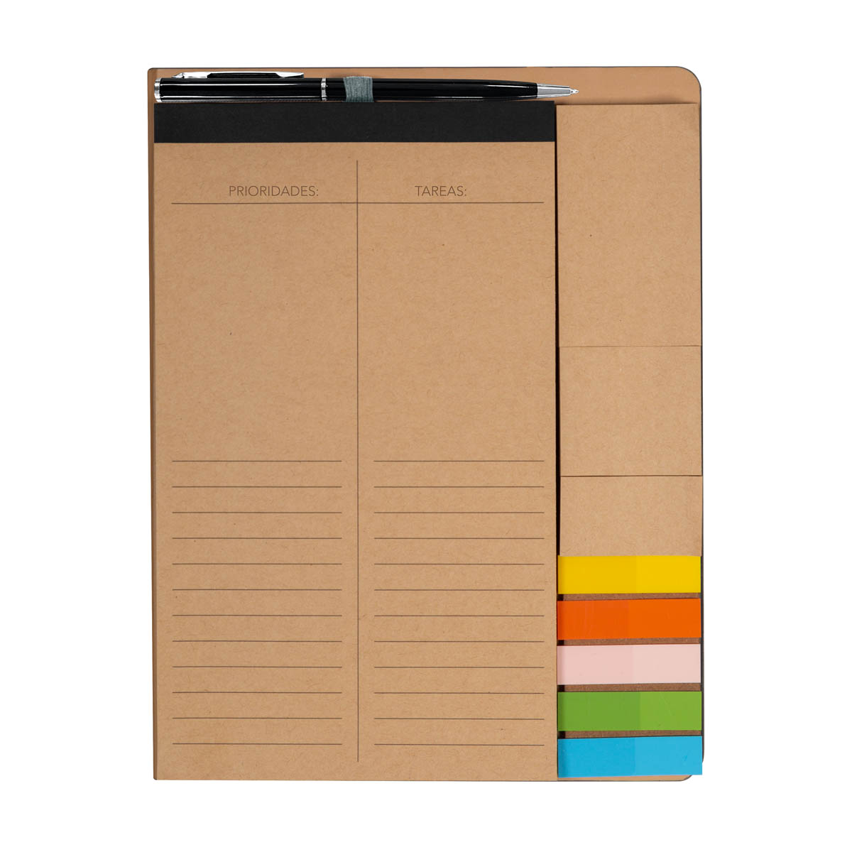 PLANEADOR YOUSSEF - Planeador de prioridades y tareas. En su interior incluye un bolígrafo metálico, un sobre de papel para almacenar o proteger documentos, un block de 70 hojas de papel Kraft con diseño de raya, 3 mini notas adhesivas y banderines adhesivos en cinco colores diferentes, con 25 piezas cada uno. Se mantiene cerrado de manera segura gracias a su banda elástica. Cubierta rígida al exterior.