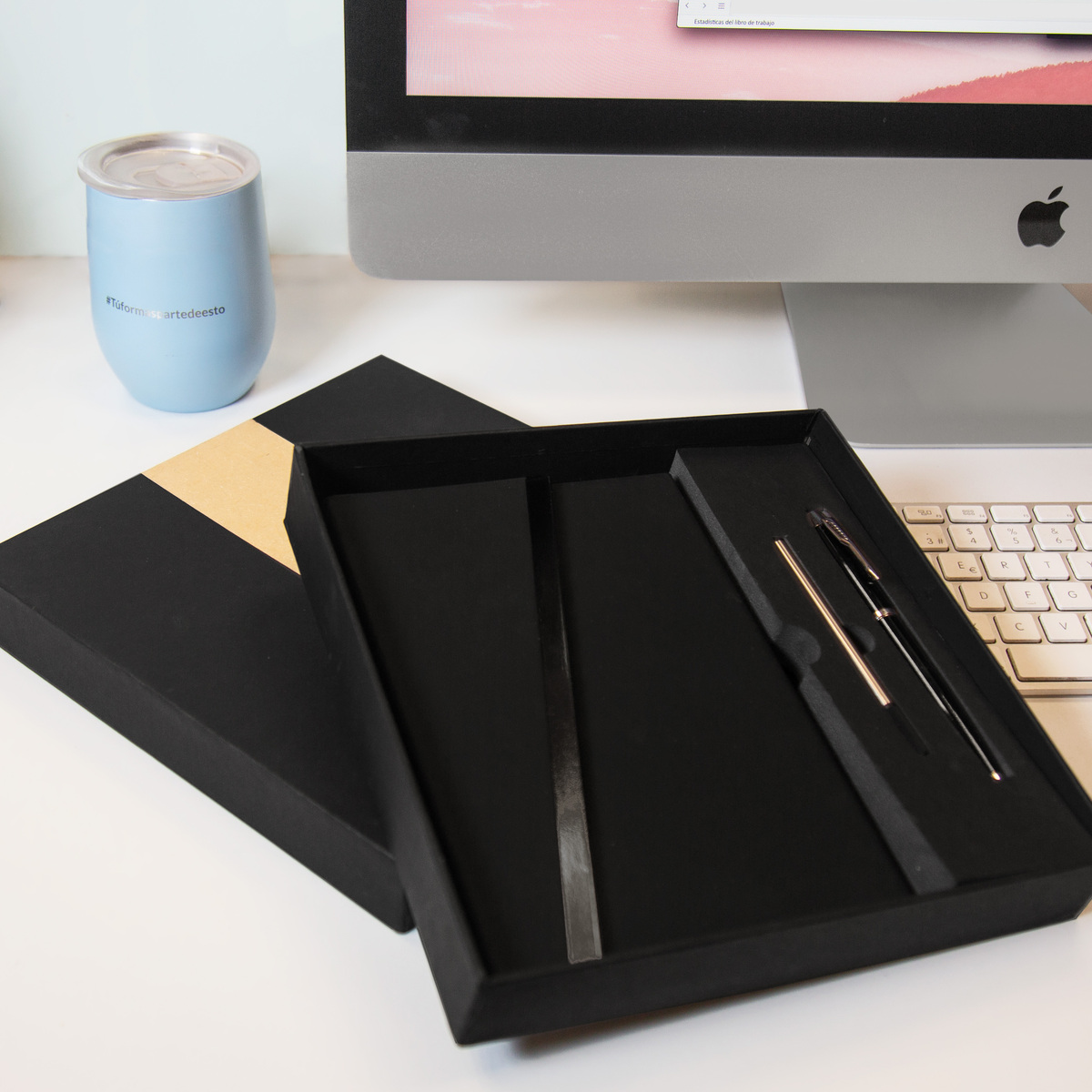 MATERIAL: Curpiel y Metal Libreta / Acero Inoxidable Bolígrafo MEDIDAS: 15 x 21 cm Libreta / 0.9 x 14 cm Bolígrafo IMPRESION: Láser y Termograbado en Libreta / Láser en bolígrafo MED. EMPAQUE: 50 x 26 x 45.5 cm PESO EMPAQUE: 3.06 Kg PIEZAS EMPAQUE: 20