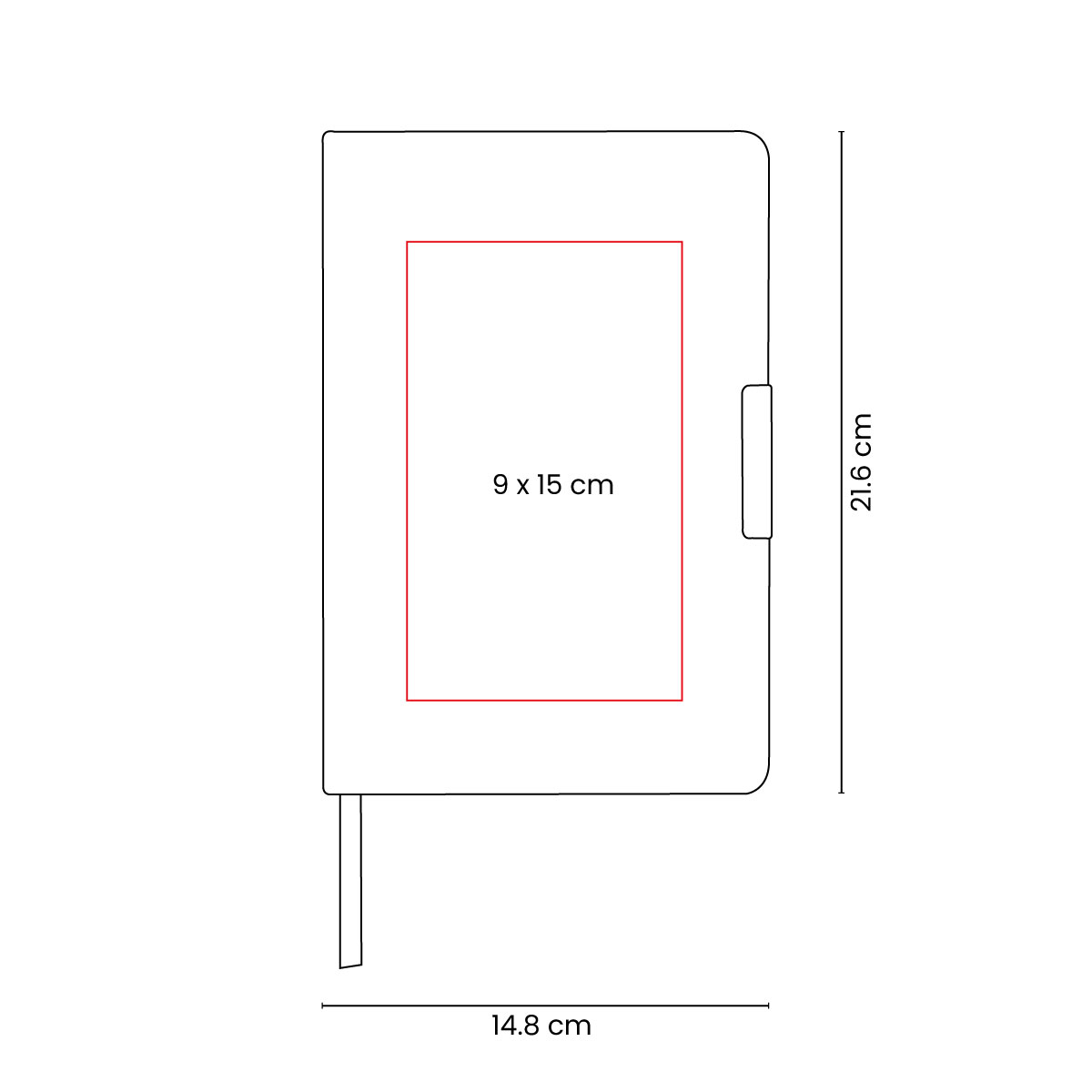 MATERIAL: Curpiel / Papel MEDIDAS: 14.8 x 21.6 cm IMPRESION: Termograbado / Serigrafía MED. EMPAQUE: 40.3 x 24.8 x 33 cm PESO EMPAQUE: 7.25 Kg PIEZAS EMPAQUE: 50