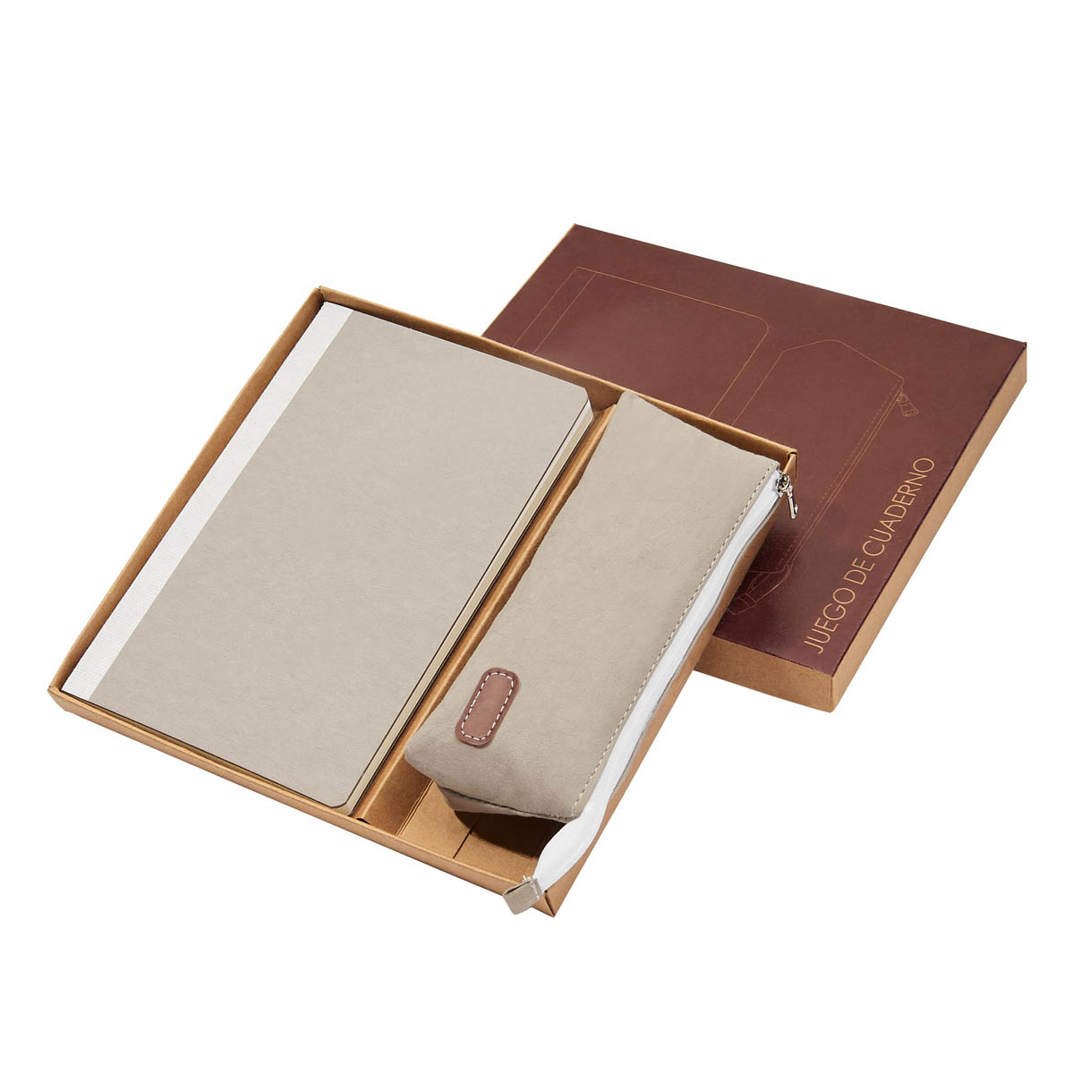 SET ECO VAVIRI - Set ecológico. Incluye libreta con 80 hojas a rayas y cubierta rígida de cartón kraft. Incluye un estuche porta-lapices de apertura con cierre y parche de curpiel, que le da un toque más elegante. La combinación de materiales, lo hace un producto perfecto para quienes buscan un equilibrio entre funcionalidad y sustentabilidad. Incluye caja individual.