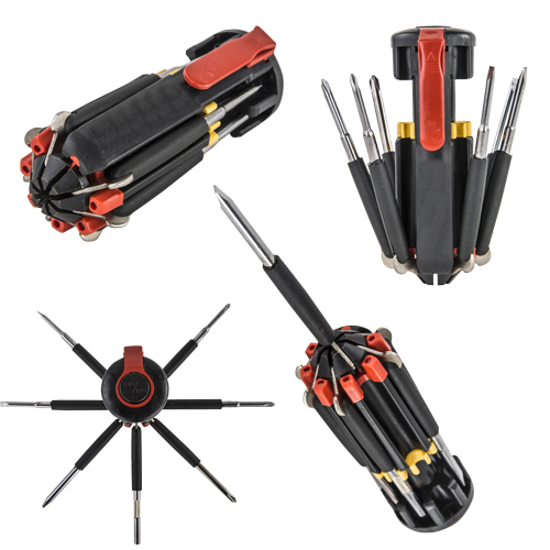OCTO Multi herramienta 8 en 1 con cuerpo de plástico, desarmador, clip y 6 leds, utiliza 3 baterías AAA (no incluidas).