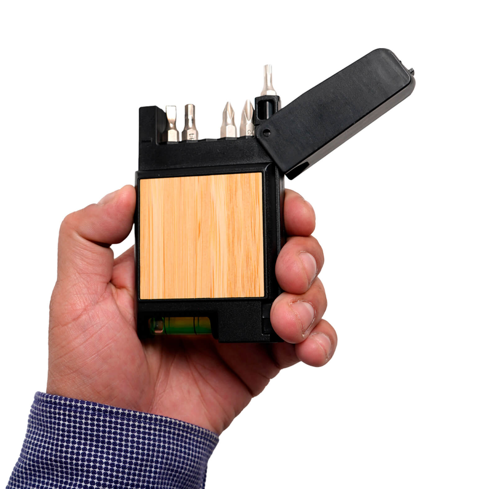 FLEXO Set de herramientas con detalle de bambú. Incluye nivel de burbuja, flexómetro y desarmador con 6 puntas intercambiables.