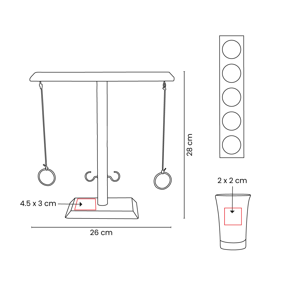 JUEGO SWING - Lleva la diversión a otro nivel con este emocionante juego de destreza para dos jugadores. El objetivo es simple pero desafiante: cada jugador debe balancear su aro e intentar fijarlo en el gancho. Si lo logra, el shot se moverá hacia su oponente. El jugador que no pueda evitar que el shot salga de la base deberá beber un shot. Perfecto para reuniones y fiestas, este juego combina habilidad, emoción y risas en cada ronda. Incluye juego con dos aros, base y shot. La madera es un producto natural el cual puede presentar variaciones en tonalidades y vetas.