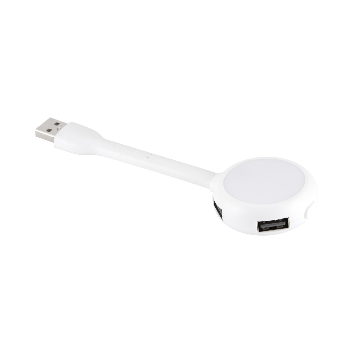 CONCENTRADOR DE PUERTOS HEZE - Concentrador con 4 puertos USB 2.0 y luz LED. Incluye botón para encender y apagar la lámpara. Cuerpo flexible. No requiere baterías.