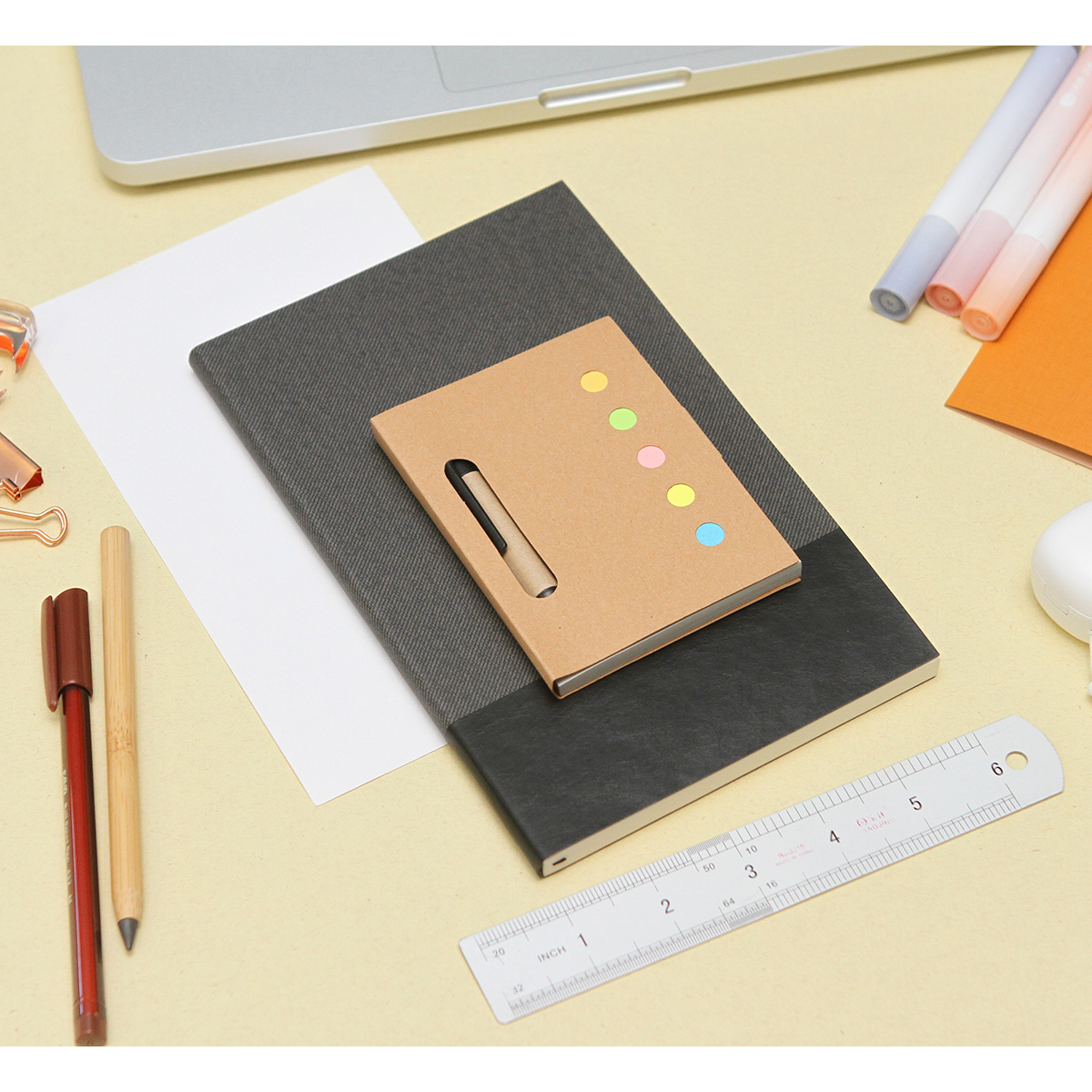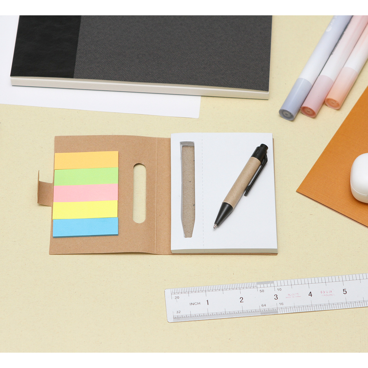 Mini libreta ecológica Pamplona. - Libreta mini ecológica con 80 hojas blancas, la mini libreta Pamplona incluye 125 banderitas de colores en cinco tonalidades diferentes. También viene con un bolígrafo de tinta negra, incluye también un porta bolígrafo en la parte interior.