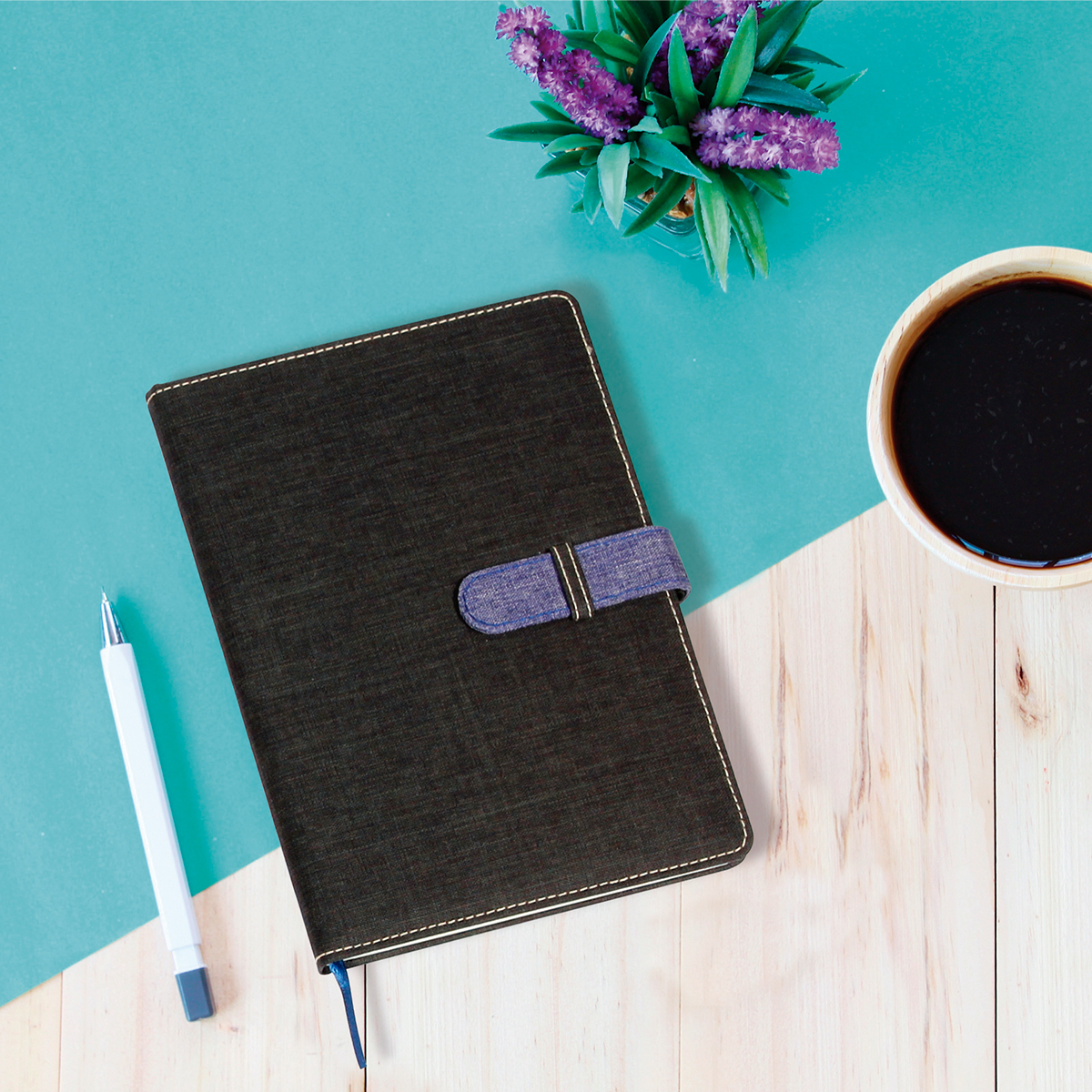 Libreta Glasgow. - Libreta fabricada en poliuretano con broche y listón separador de hojas en color, con 80 hojas de raya. Tamaño A5.