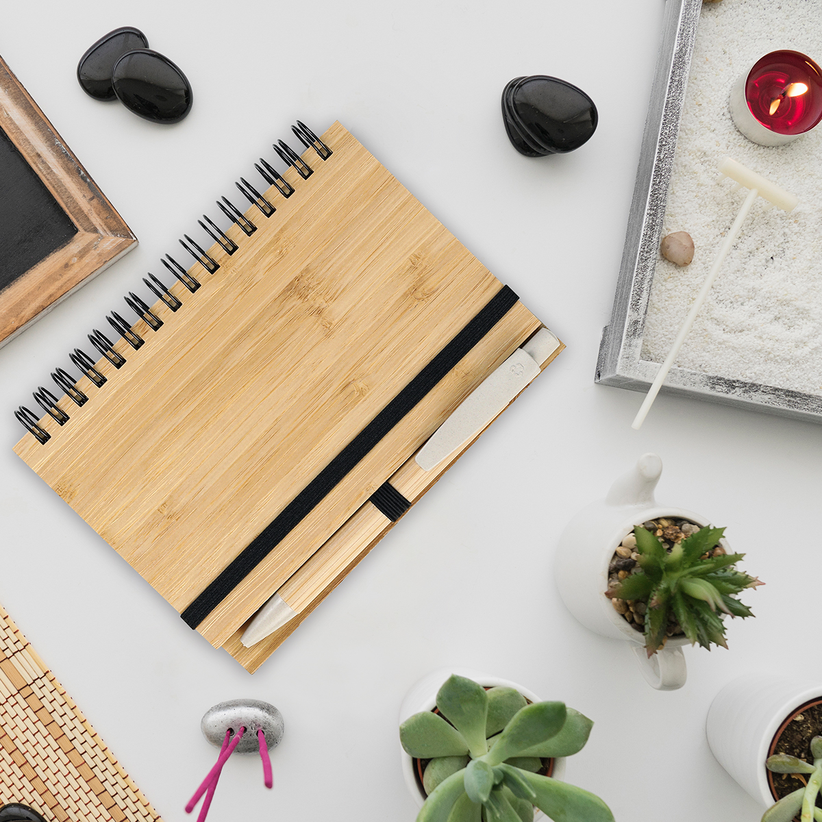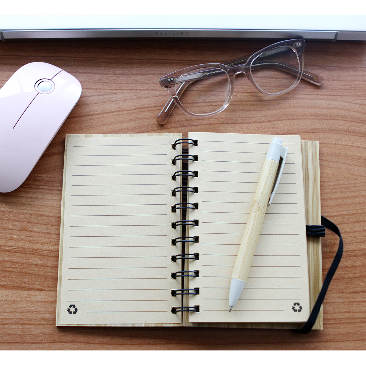 Libreta Torun. - Libreta con pasta rígida de bambú, 70 hojas de papel kraft, con banda elástica y bolígrafo con barril de bambú y detalles en fibra de bambú. Tinta de escritura negra. Tamaño A6.