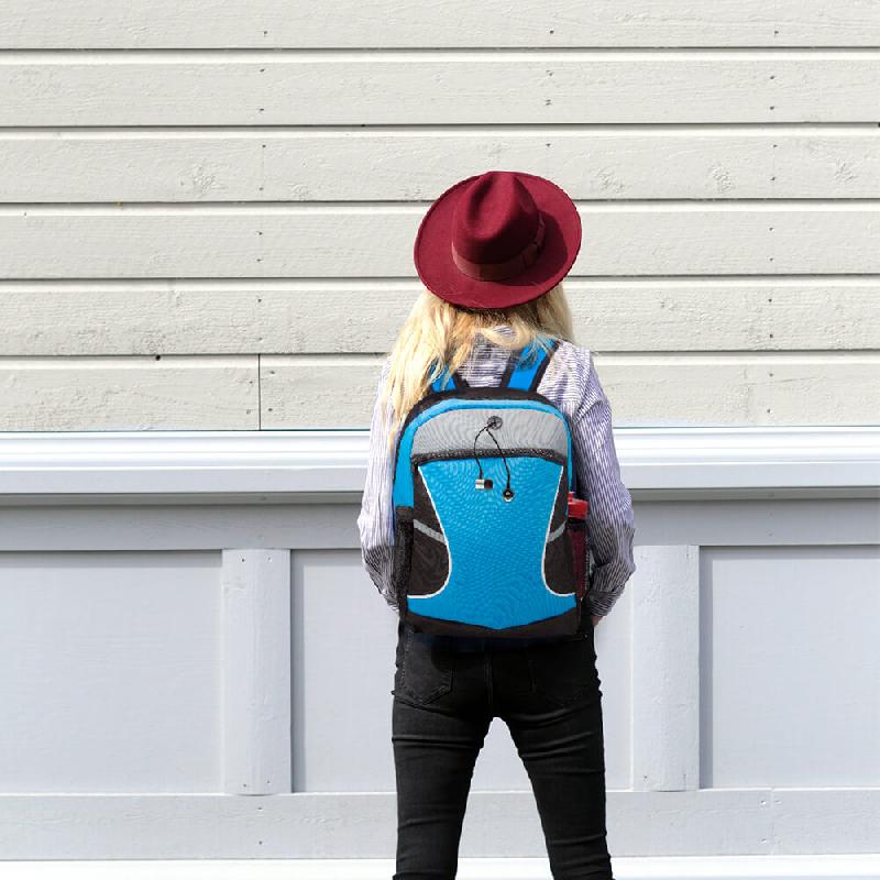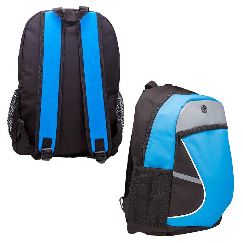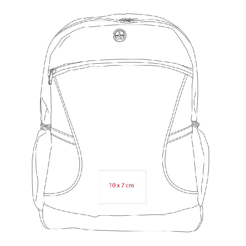 Mochila de poliéster. Cuenta con bolsa frontal de cierre y porta audífonos ademas de una bolsa lateral en mesh. Medidas: 30 x 43 x 14.5 cm Material: Poliéster 600D con respaldo de PVC.