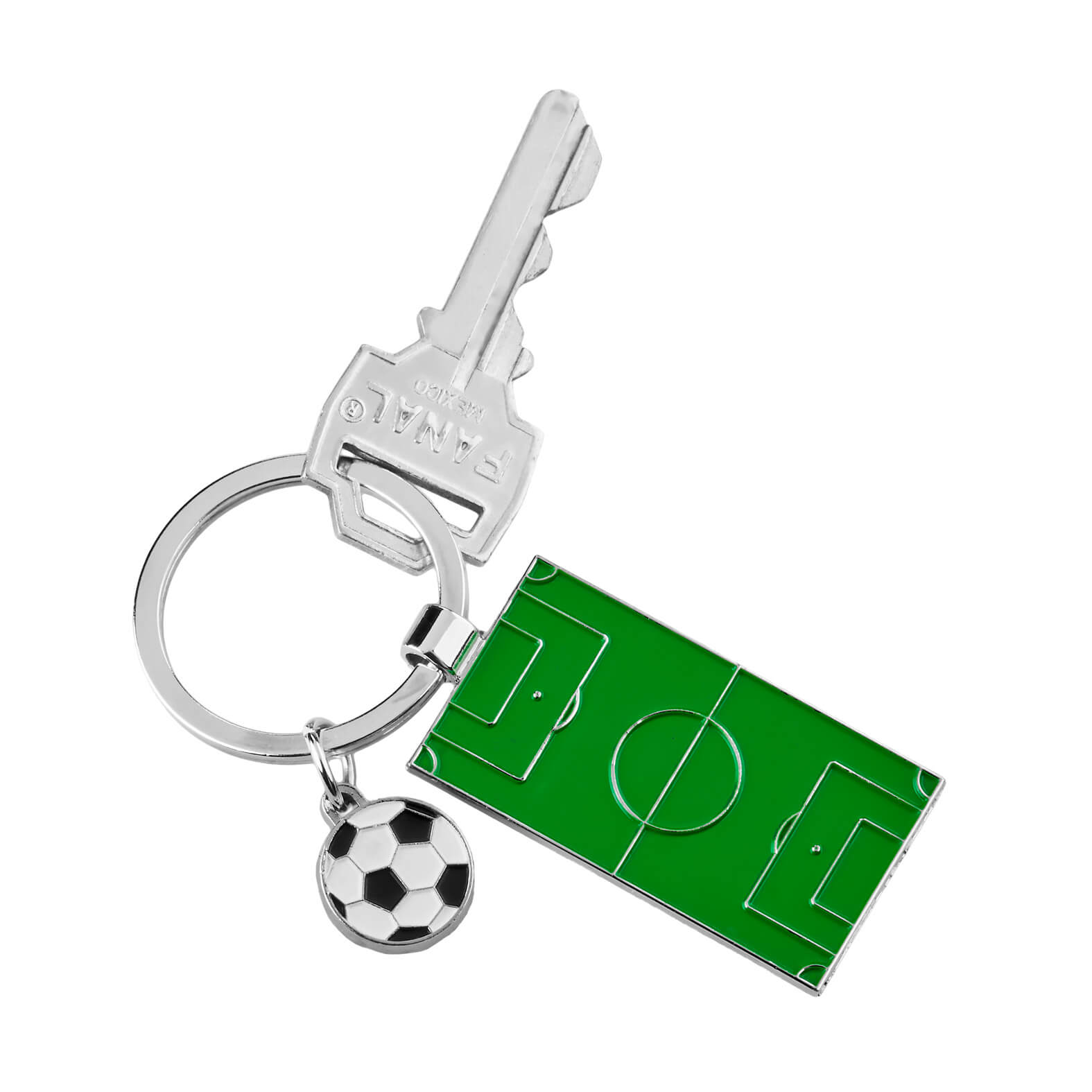 CANCHA Llavero metálico con forma de cancha de futbol, balón y aro reforzado.