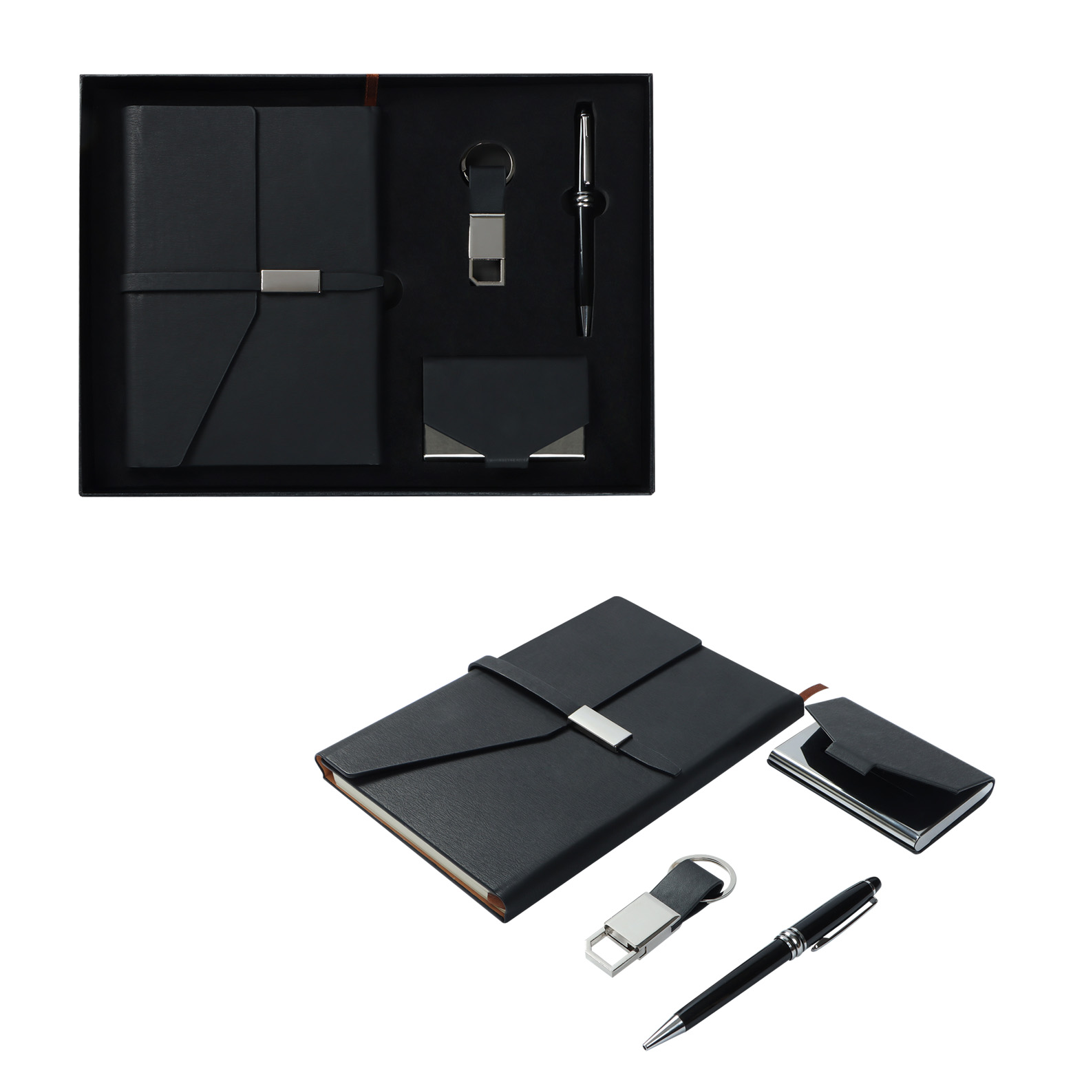 BASS Set ejecutivo que incluye: 1 libreta tipo carpeta con cierre magnético, 1 llavero metálico con correa, 1 pluma de metal con mecanismo retráctil y un tarjetero.