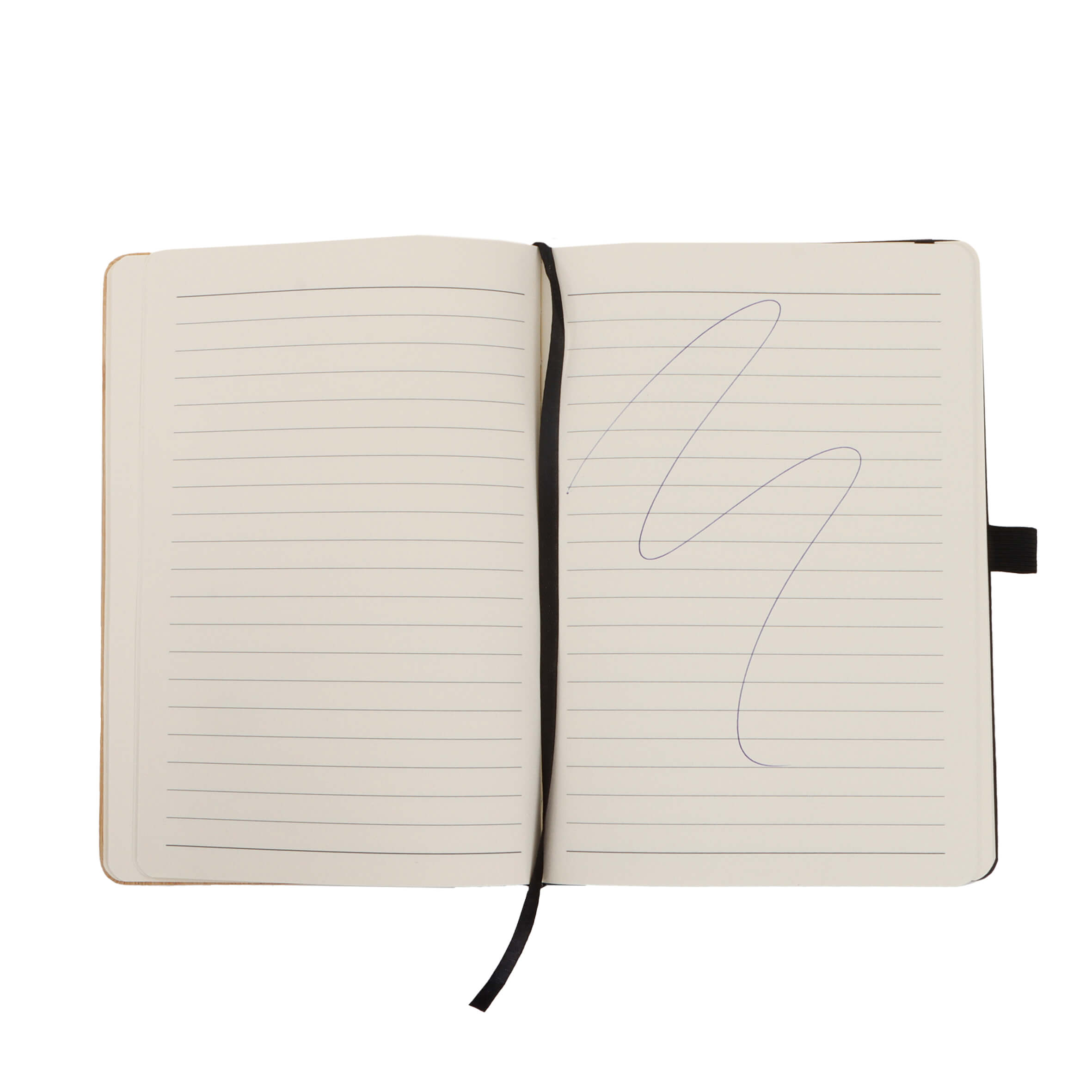 OPAL Libreta de poliuretano con simulación de madera, 92 hojas rayadas, separador y bolígrafo con acabado rubber.