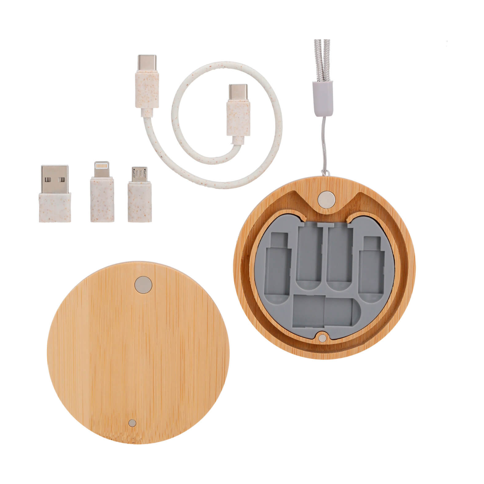 BULUH Caja de almacenamiento de bambú con cables adaptadores de wheat straw. Incluye 1 cable con salidas tipo C, 1 adaptador USB, 1 adaptador lightning y 1 adaptador Micro.