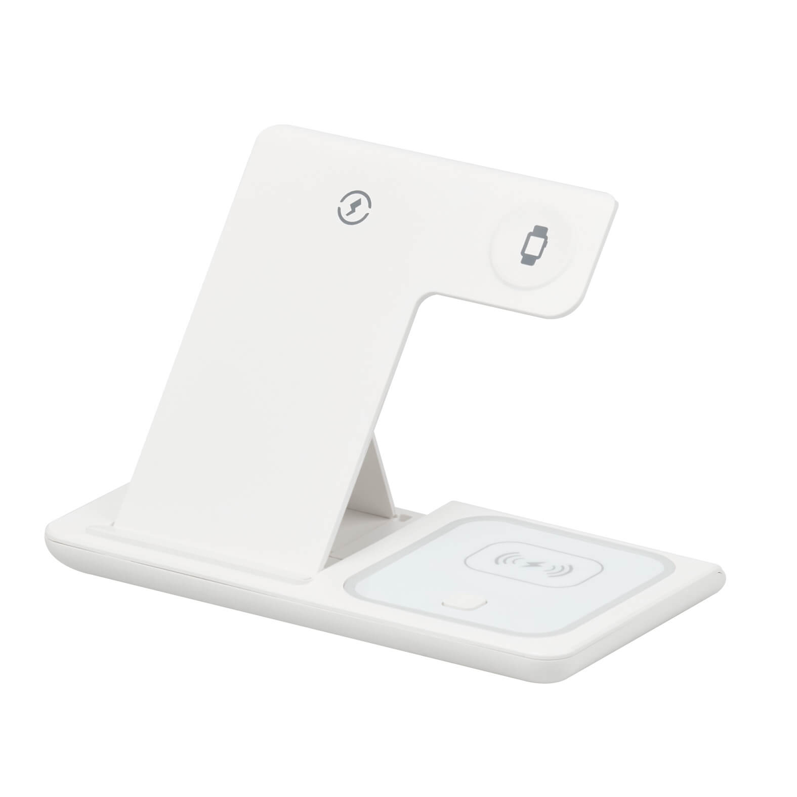 MORK Multicargador inalámbrico plegable 3 en 1 para smartphone, audífonos y reloj inteligente. Cuenta con botón para luz e incluye cable de carga Tipo C. Compatible solo con dispositivos con tecnología Qi.