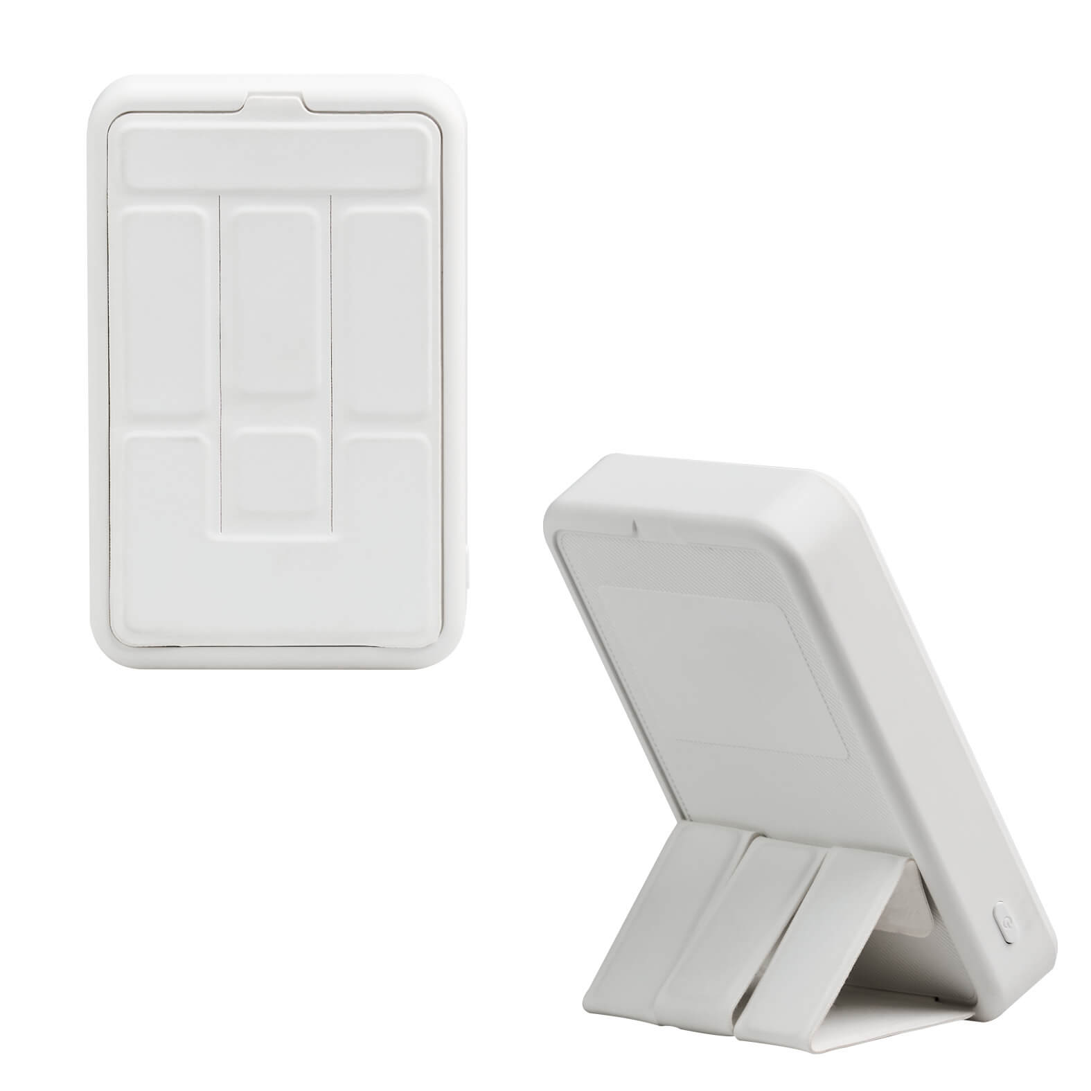 SONAR Power Bank inalámbrico de 10,000 mAh con acabado rubber y soporte plegable. Cuenta con una entrada USB, una Micro USB, una Tipo C y una Lightning. (Compatible con dispositivos con tecnología Qi).