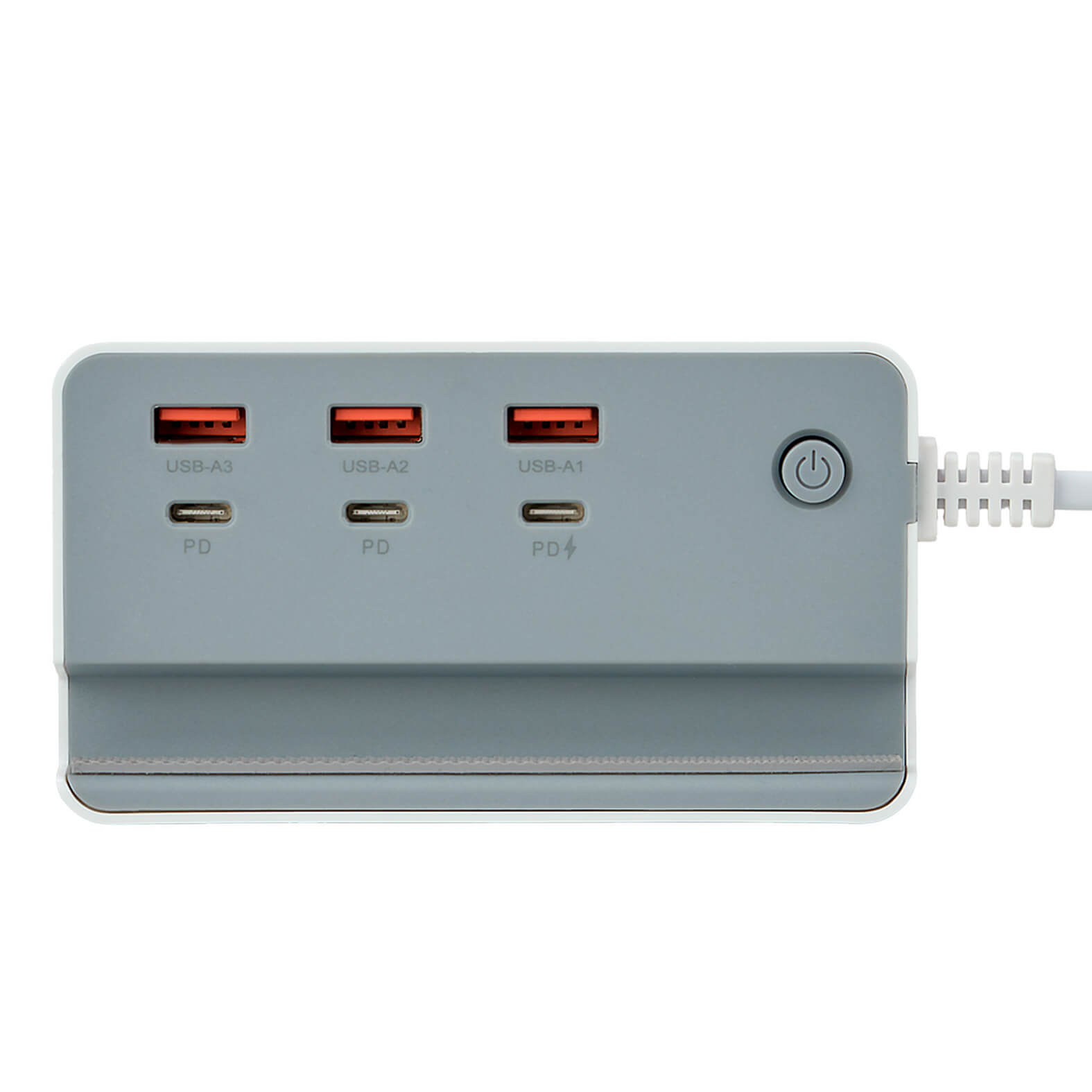 BENDER Concentrador de plástico con tres puertos USB, tres puertos Tipo C, botón de encendido/apagado y cable de conexión universal.