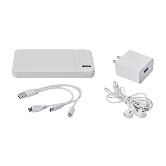 SET POLO - Incluye batería auxiliar para smartphone de 8,000 mAh con 2 puertos de carga micro USB y tipo C, 2 puertos USB y 4 LEDs para indicar nivel de carga, cargador de pared con entrada USB, audífonos con control de volumen y función play/pausa, cable cargador USB con entradas micro USB, tipo C y lightning. Incluye estuche con cierre.